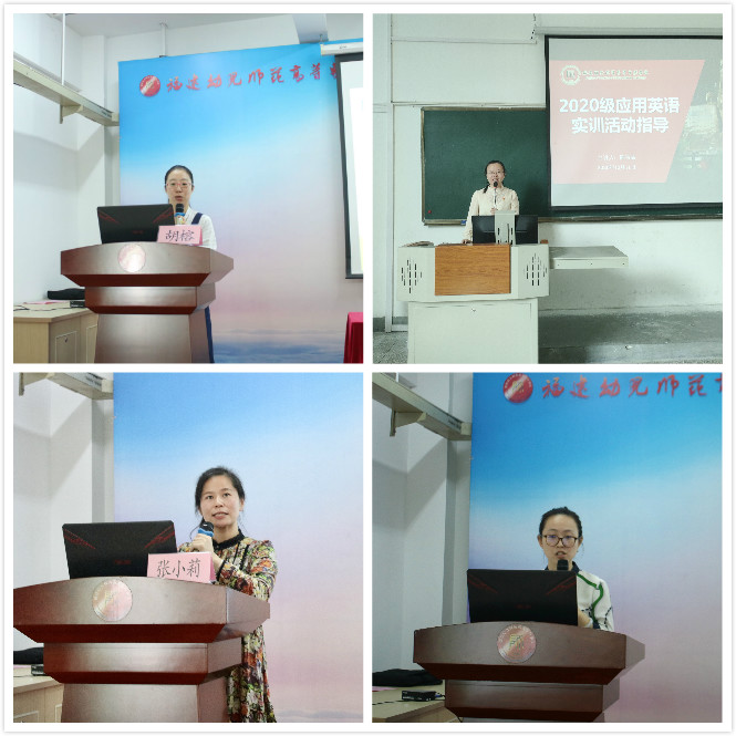 接着,席颖老师介绍了校内实践教学的各个项目,鼓励同学们积极开展英文书写、简笔画、教师口语等日常训练;张小莉老师讲解了教师资格证考试,包括考试科目、考试大纲等。最后,胡榕老师和陈雪晶老师分别从英语教育专业和应用英语专业校外实训模块、实训安排、实训特点以及实训建议四个方面展开指导,要求学生明确实训目的,学会理论联系实际,善于提出问题,积极主动求教,注意安全问题,及时总结归纳,从而提升专业实践能力。