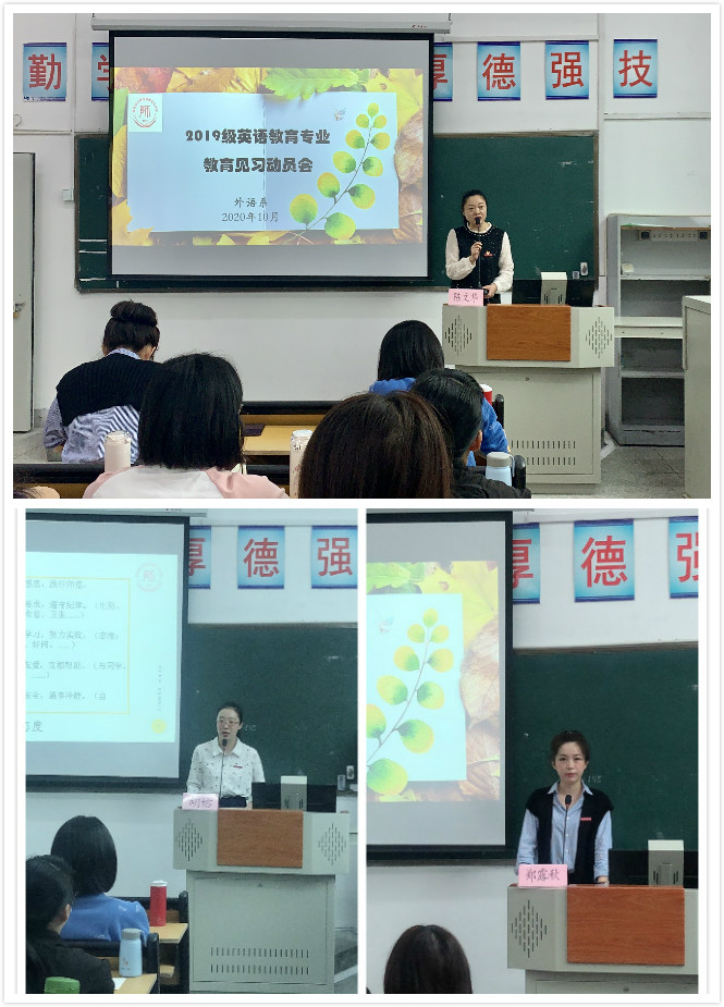 为更好地落实2019级英语教育专业教育见习工作,我系于2020年10月13日上午在3号楼105教室召开教育见习动员会。外语系陈文华副主任及指导教师胡榕、郑露秋、林凌参加本次动员会。