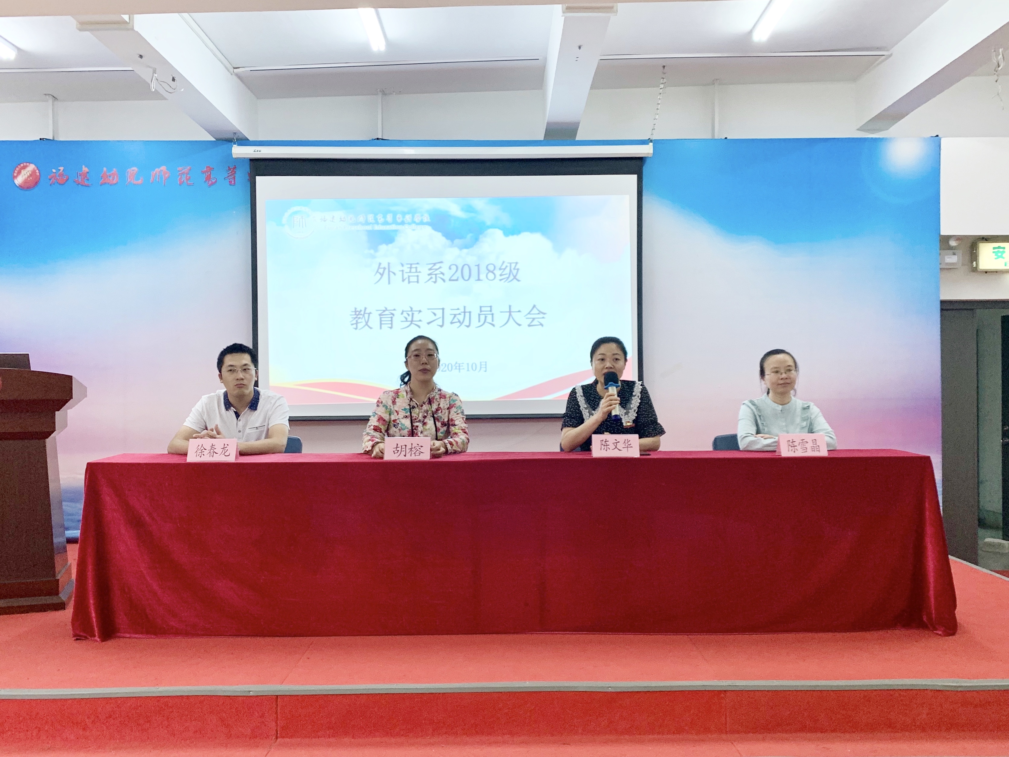 教学实习、扬帆起航,磨炼自己、展望未来。2020年10月15日下午,外语系于2号楼三层召开2018级教育实习动员大会。外语系副主任陈文华及教研室主任陈雪晶、胡榕,辅导员徐春龙参加本次会议。