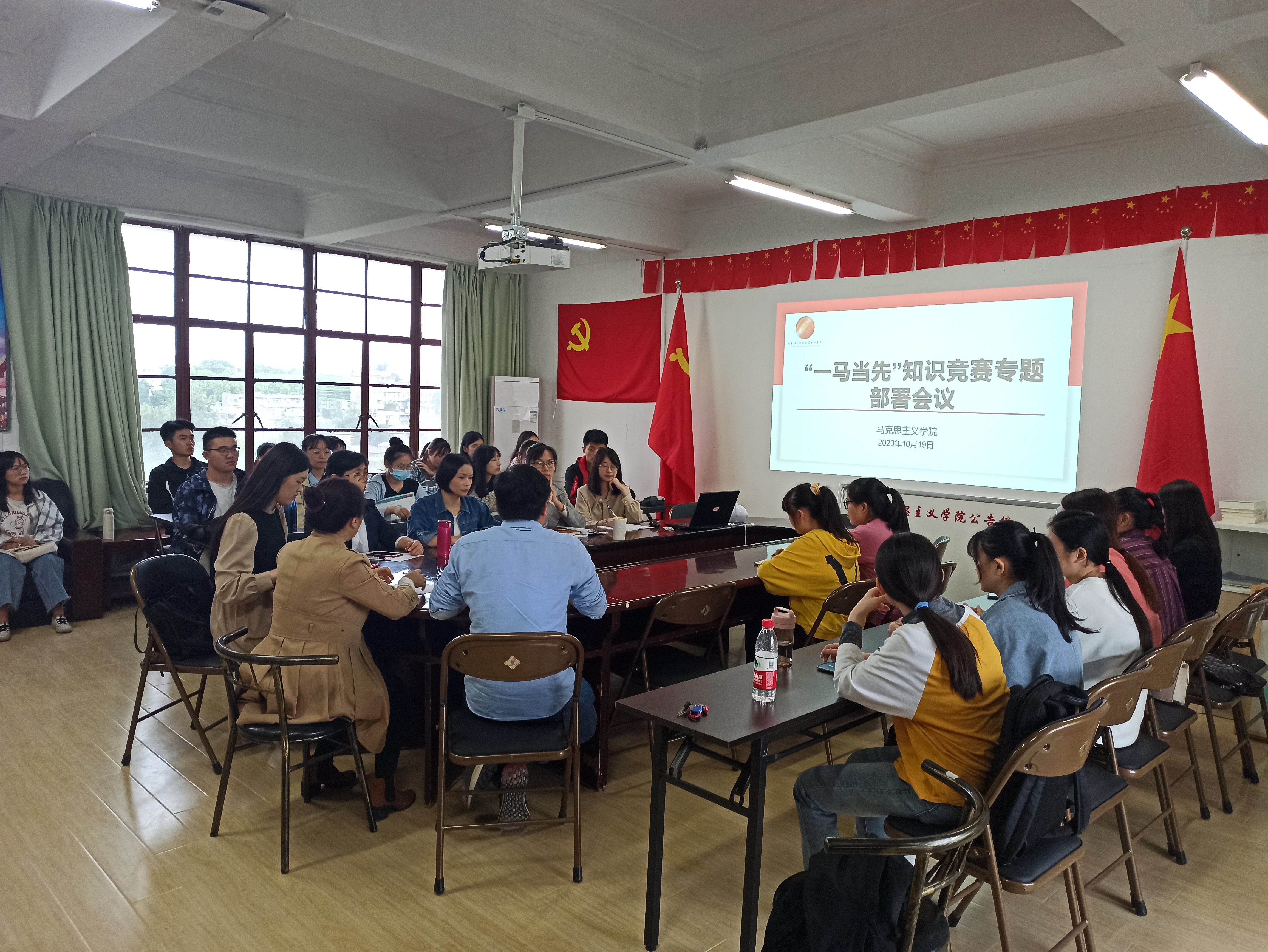 2020年10月19日,马克思主义学院在系部教研楼601召开"一马当先"知识竞赛专题部署会议。校学工部副部长张良、全院教师和参赛学生参加。伊文婷院长主持会议并讲话。