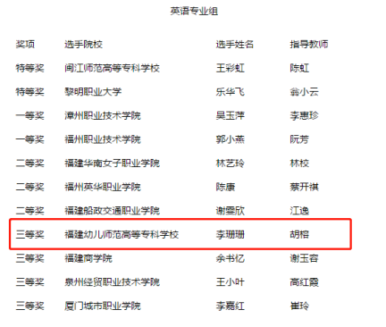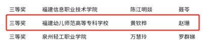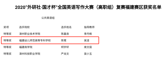 近日,2020"外研社·国才杯"全国英语写作大赛(高职组)福建赛区复赛在闽江师范高等专科学校举行,来自福建省27所高职院校的62位选手参加了本次大赛。我校外语系教师团队带领学生喜获3项荣誉,学前教育系陈鹭(指导教师:吴凌)和黄钦桦(指导教师:赵珊)获得公共英语组特等奖和三等奖,外语系李珊珊(指导教师:胡榕)获得英语专业组三等奖。同时,陈鹭将代表福建省参加在北京举行的全国总决赛。