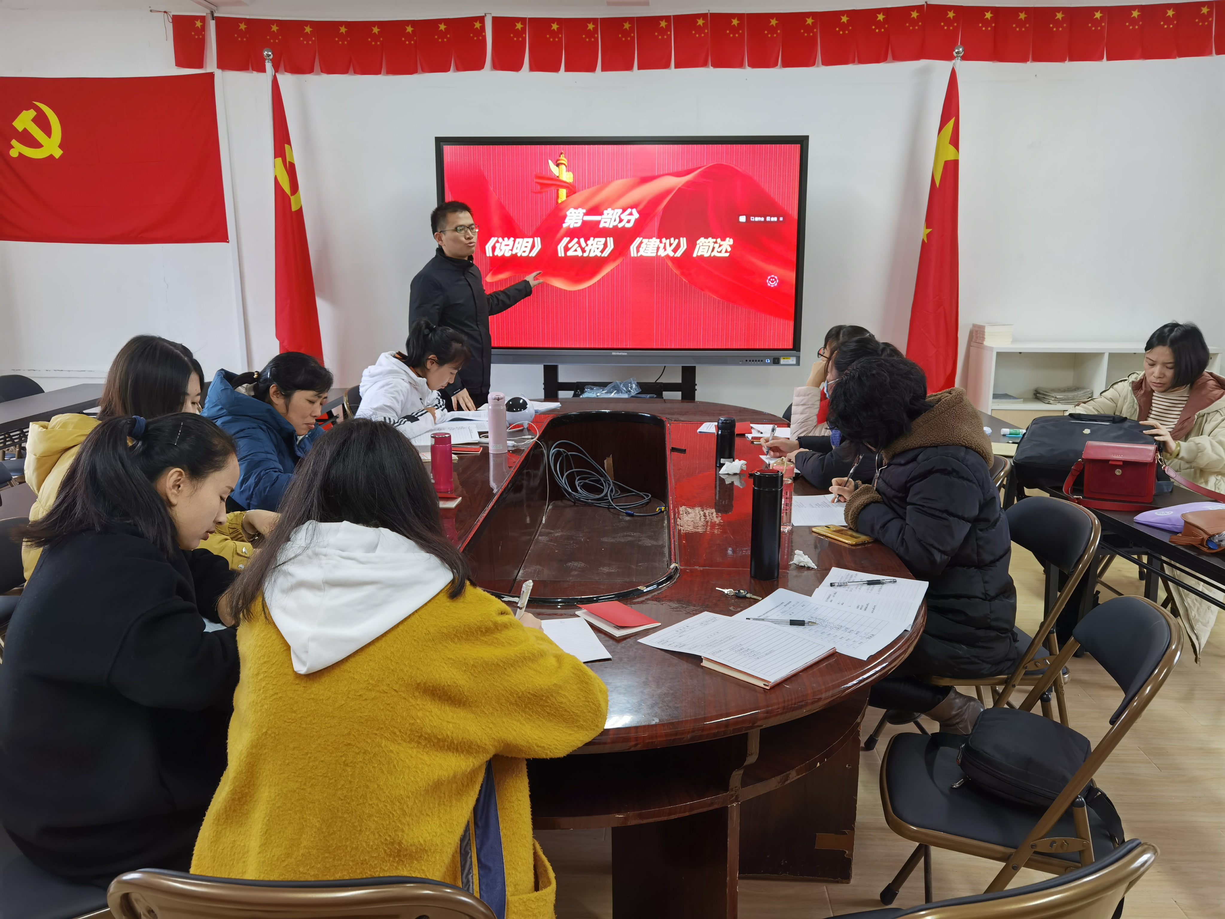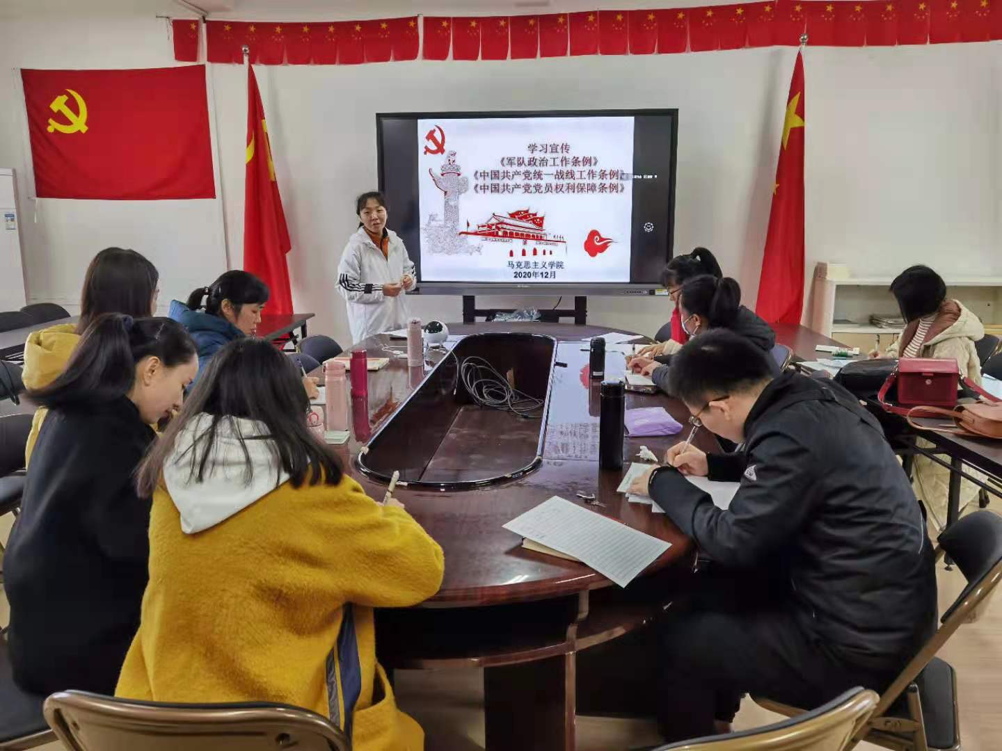 2020年12月17日下午,马克思主义学院组织全体党员教师于系办601会议室开展政治理论学习。支部宣传委员郑舒丹老师和党员教师陈奕霖担任主讲。