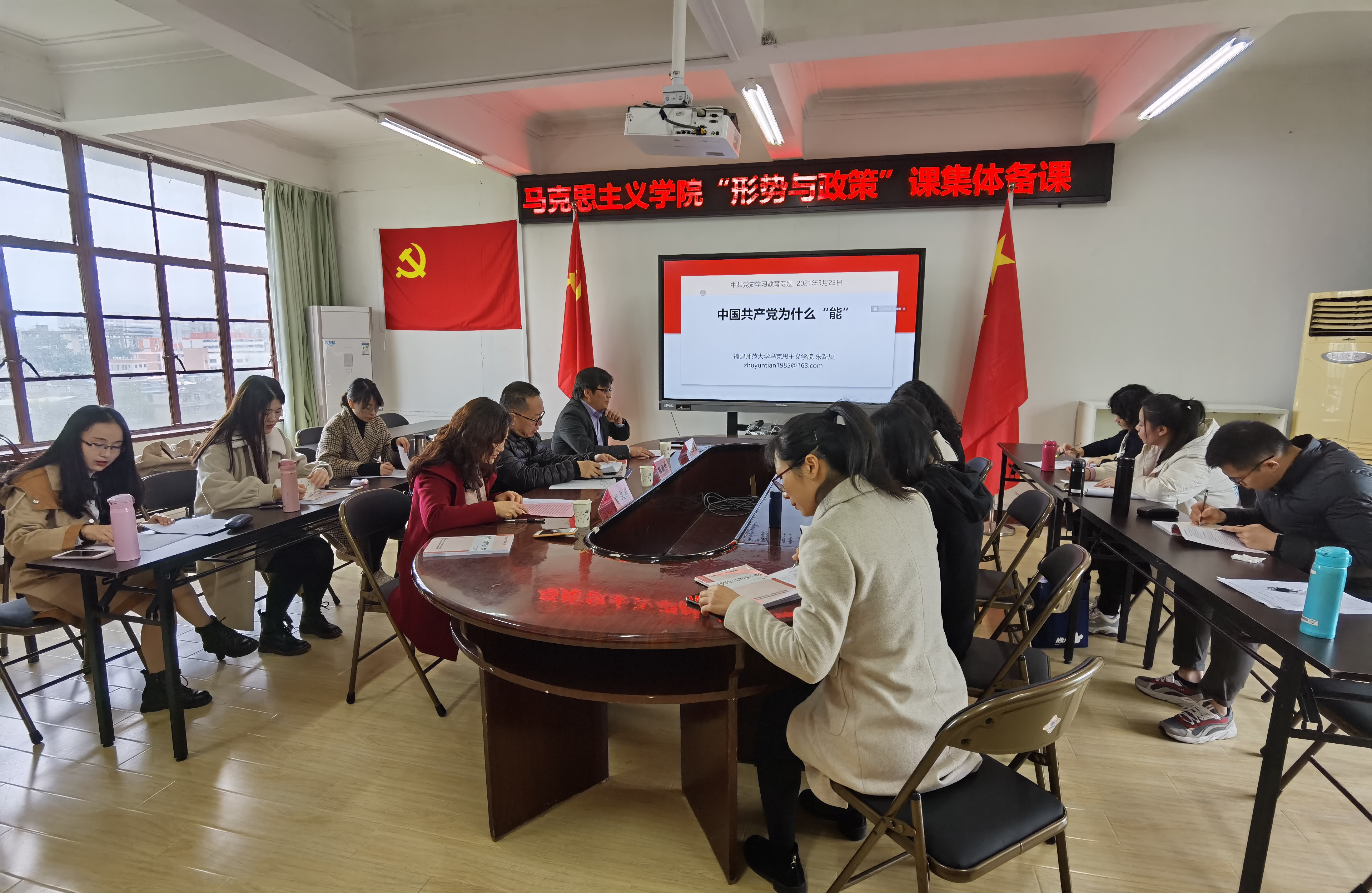 2021年3月23日上午,马克思主义学院于院办601开展《形势与政策》课集体备课暨党史学习教育党日活动。此次集备特邀福建师范大学马克思主义学院朱新屋副教授进行主讲。校党委邹雄伟副书记及马院全体专任教师参加。