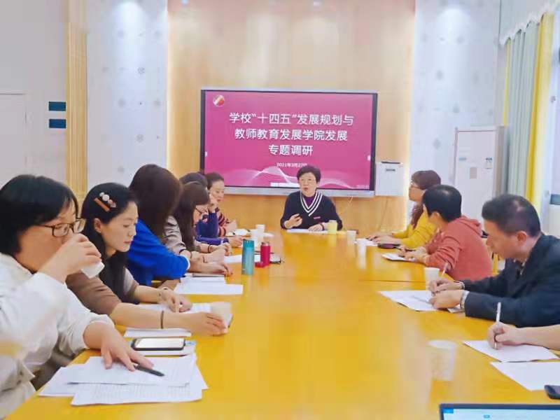 为科学研究编制"十四五"规划,引领学校改革以及推动教师教育发展学院高质量发展,3月27日下午,陈峰校长、陈凤玉副校长率人事处、办公室代表赴教师教育发展学院开展专题调研会,会议由薛少红院长主持,我院教师代表参加了此次会议。