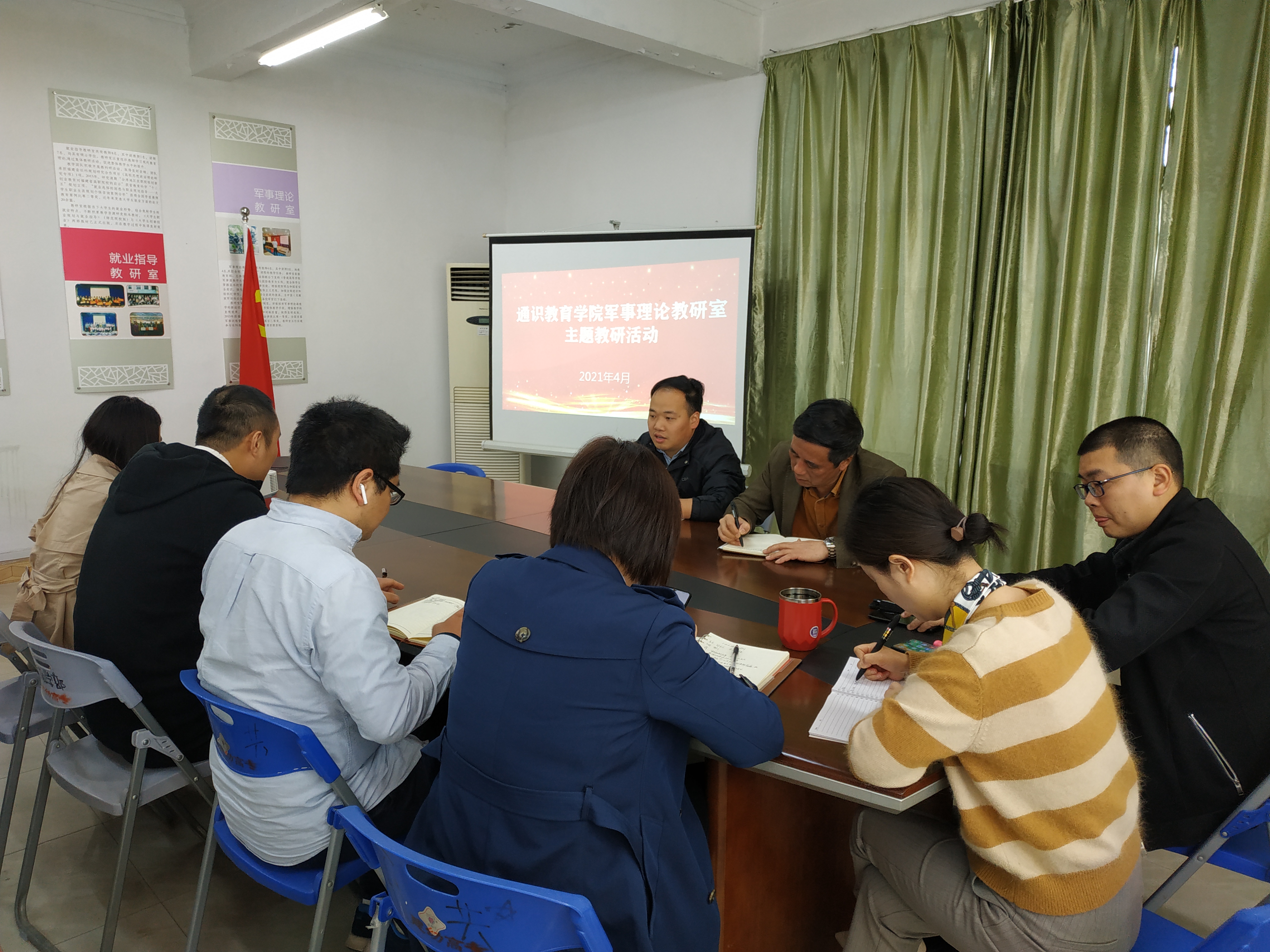 2021年4月7日,军事理论教研室在系部教研楼506开展"提升教学有效性"主题教研活动。陈福榕院长出席会议,院办公室、教研室成员共同参与。会议由教研室主任李猷艺主持。