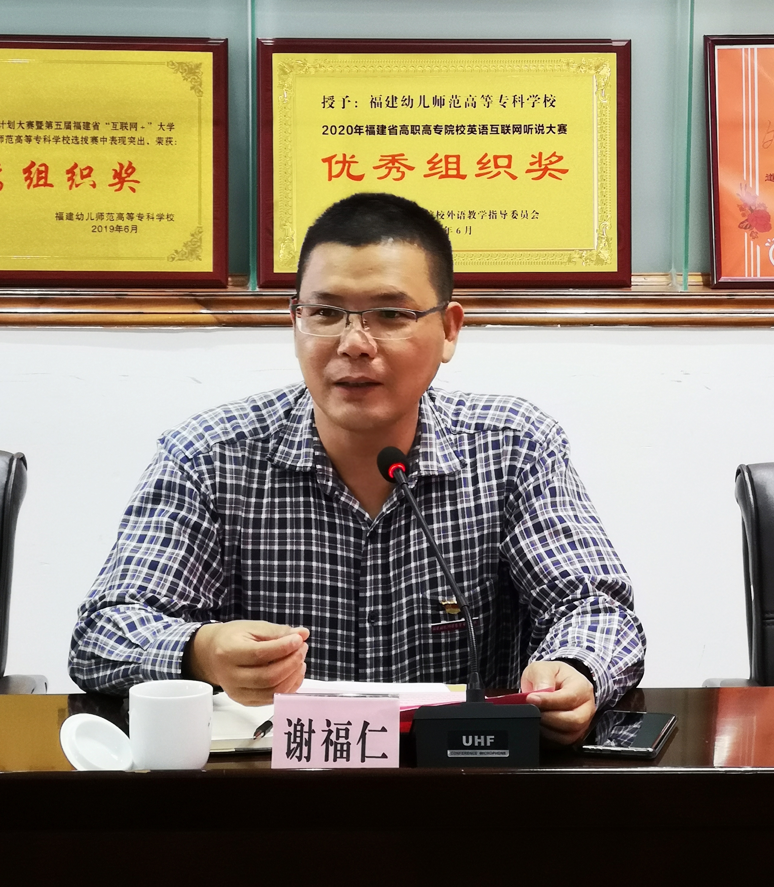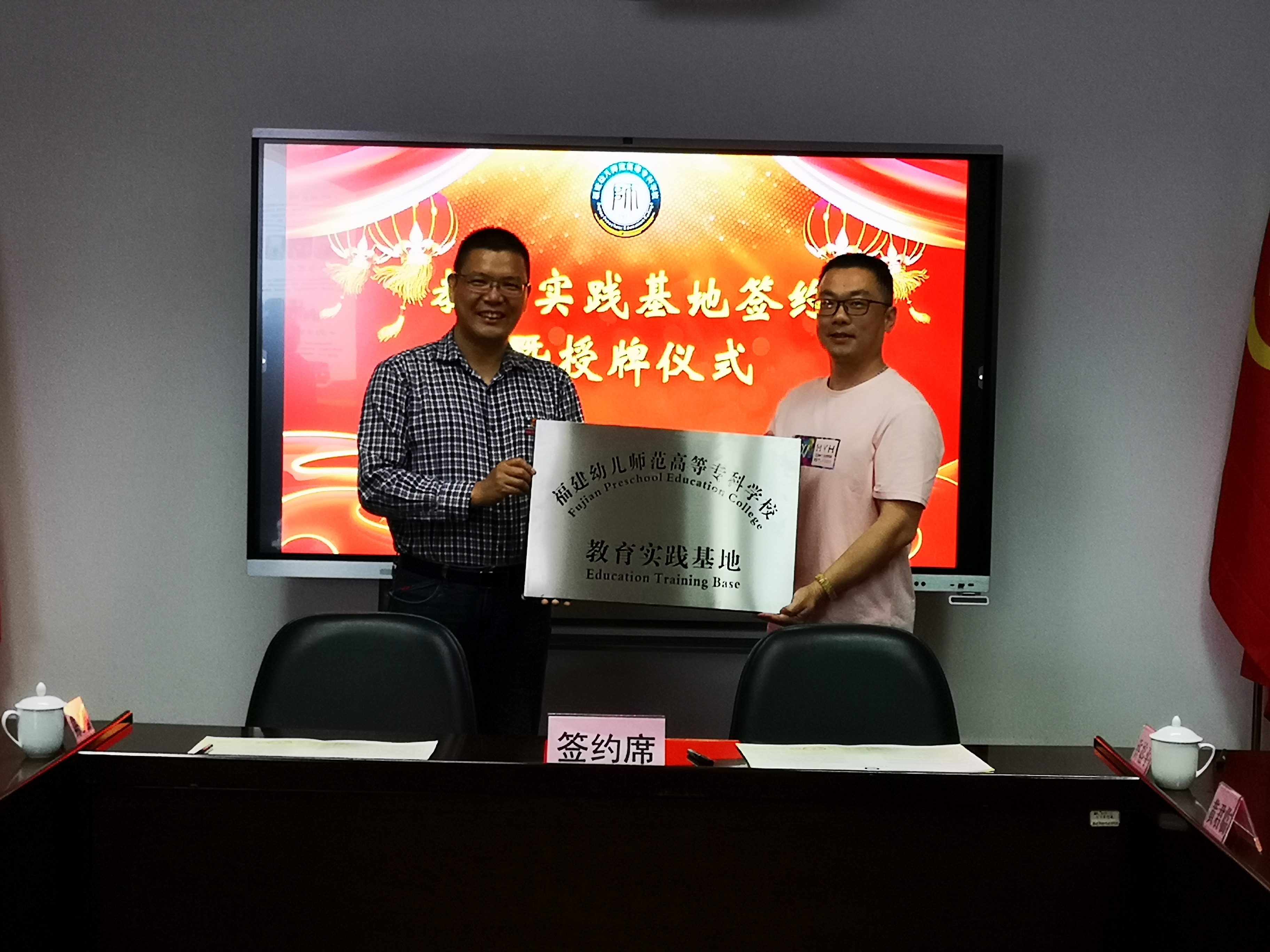 在所有与会人员的见证下,双方签订了教育实践基地协议。谢福仁副校长为东升小学授予"福建幼儿师范高等专科学校教育实践基地"牌匾。