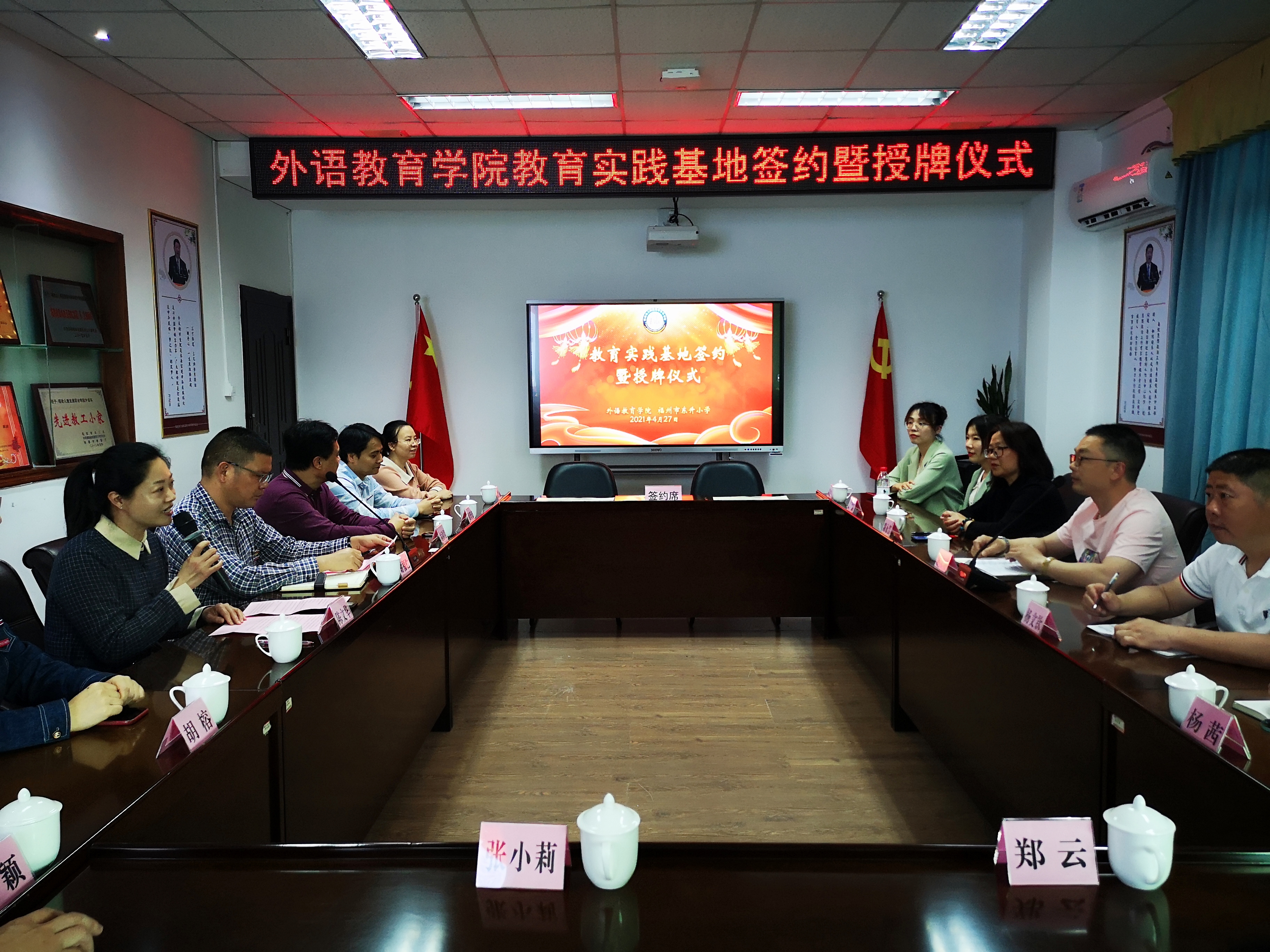 为深化产教融合,推进人才培养模式改革,更好地做"精"、做"实"人才培养工作,4月27日下午,外语教育学院与福州市东升小学在金山校区隆重举行教育实践基地签约暨授牌仪式。校党委委员、副校长谢福仁,东升小学校长林江庄、书记杨文钦、副校长陈永芳等一行,外语教育学院党总支书记林祥昊、副院长陈文华、副书记胡华荣以及各教研室主任出席仪式。仪式由陈文华副院长主持。