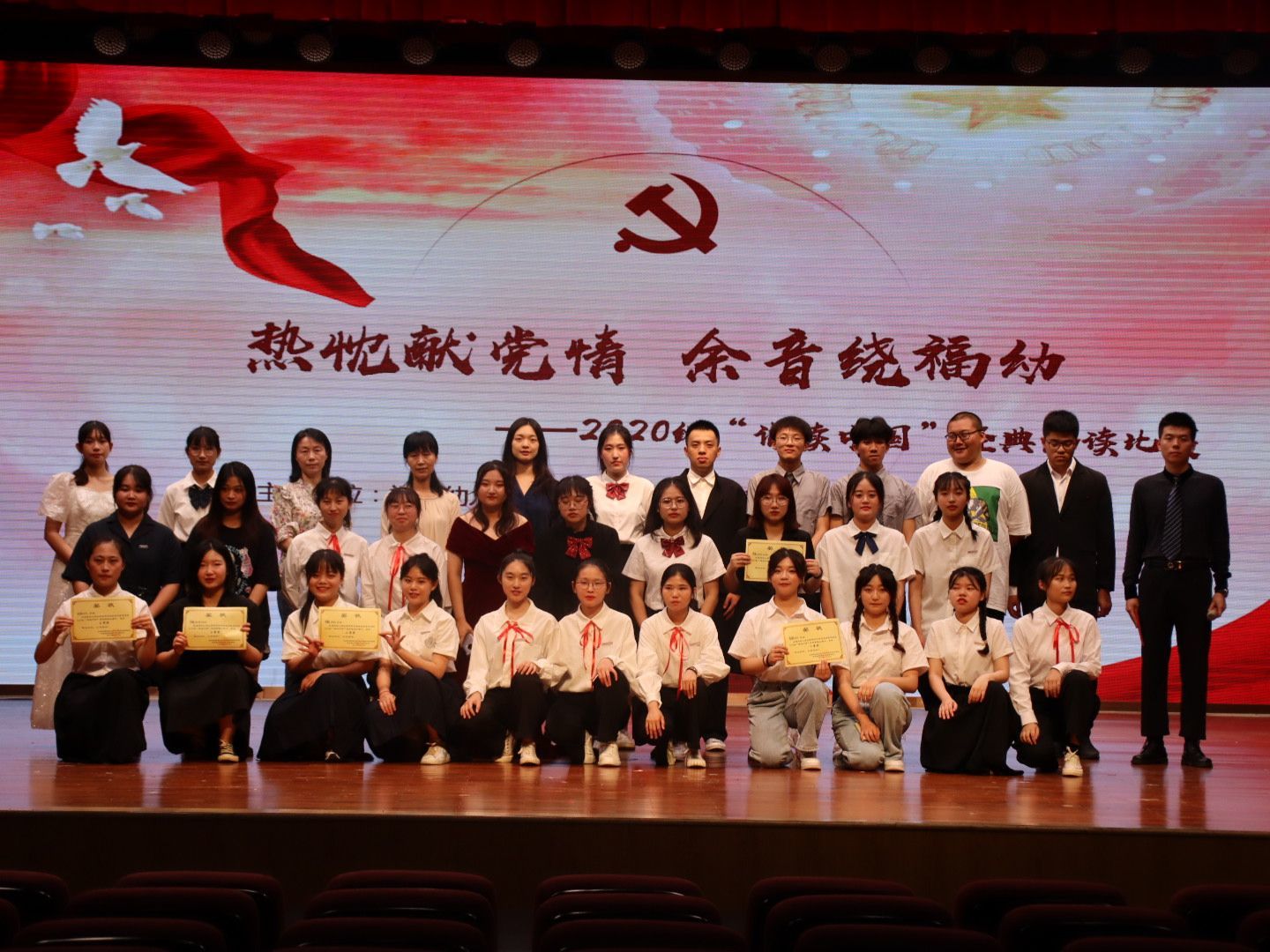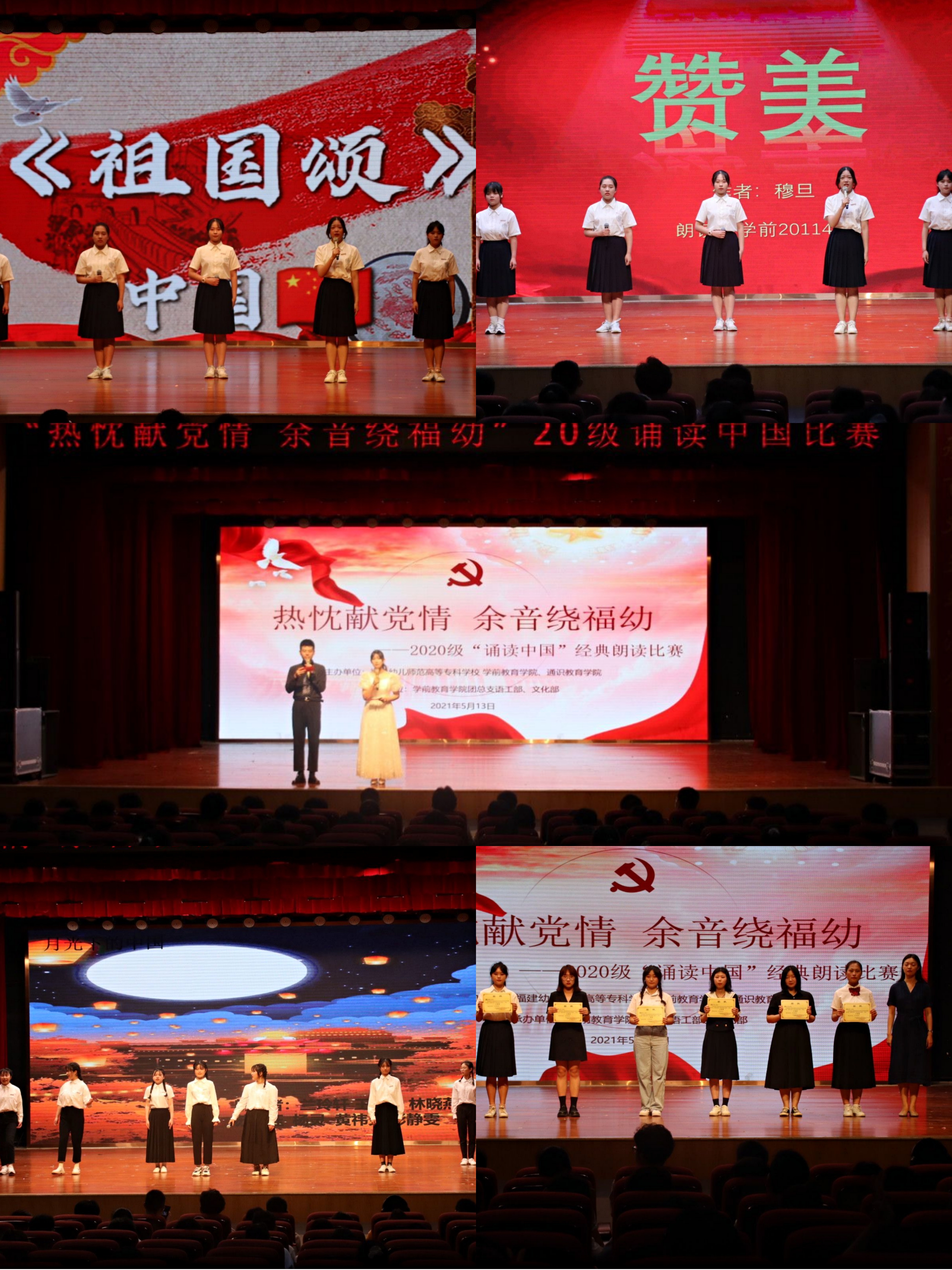 5月13日晚,通识教育学院在仓山校区礼堂举办学前教育专业2020级"诵读中国"朗诵比赛,每个班选送一个作品参赛,共有17个作品同台竞技,学生们以铿锵的语调热情讴歌中华民族实现伟大复兴的百年奋斗历程、诠释中华文化的深刻内涵。经过激烈的比拼,早教2011班的蒋怡文、陈佳梅以一首激情四溢的《诗意中国》拔得头筹,另有5个班级代表队获得二、三等奖。