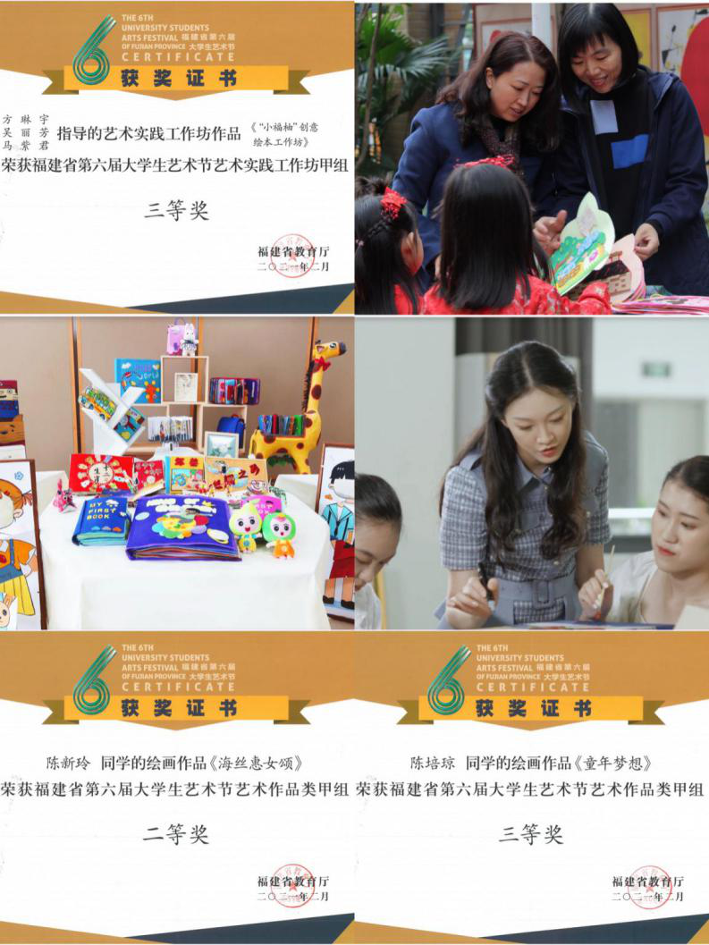 近日,由福建省教育厅主办的福建省第六届大学生艺术节奖项颁布,学前教育学院方琳宇、吴丽芳和马紫君老师指导的艺术实践工作坊作品《"小福柚"创意绘本工作坊》荣获艺术实践工作坊甲组三等奖,方琳宇老师指导的学生绘画作品《海丝惠女颂》荣获艺术作品类甲组二等奖,杨幼梅老师指导的学生绘画作品《童年梦想》荣获艺术作品类甲组三等奖。