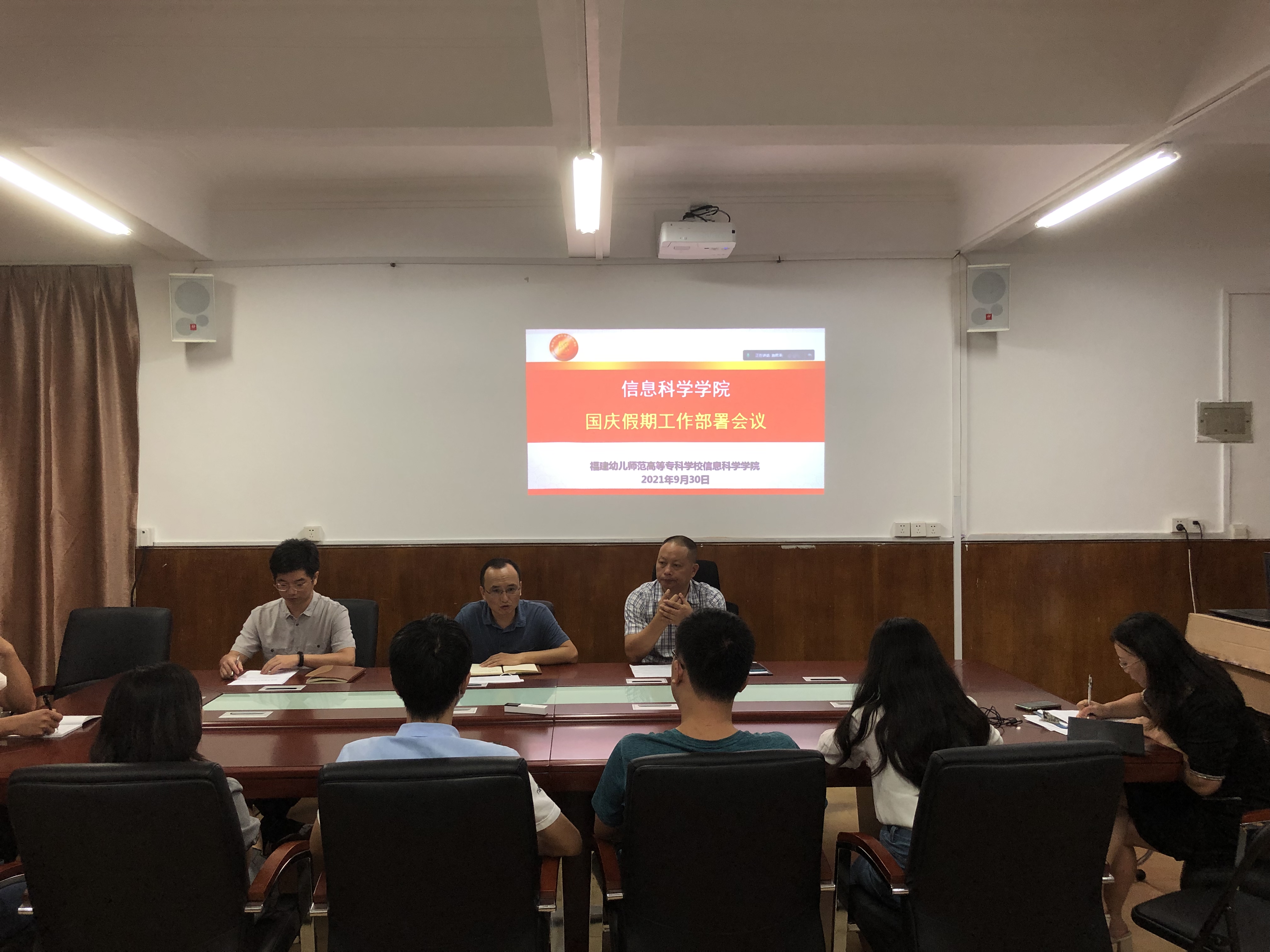 2021年9月30日下午,信息科学学院召开国庆假期工作部署会议,陈宁华院长主持,会议采用线上线下相结合的方式进行,全体行政人员线下参与,专任教师线上出席。