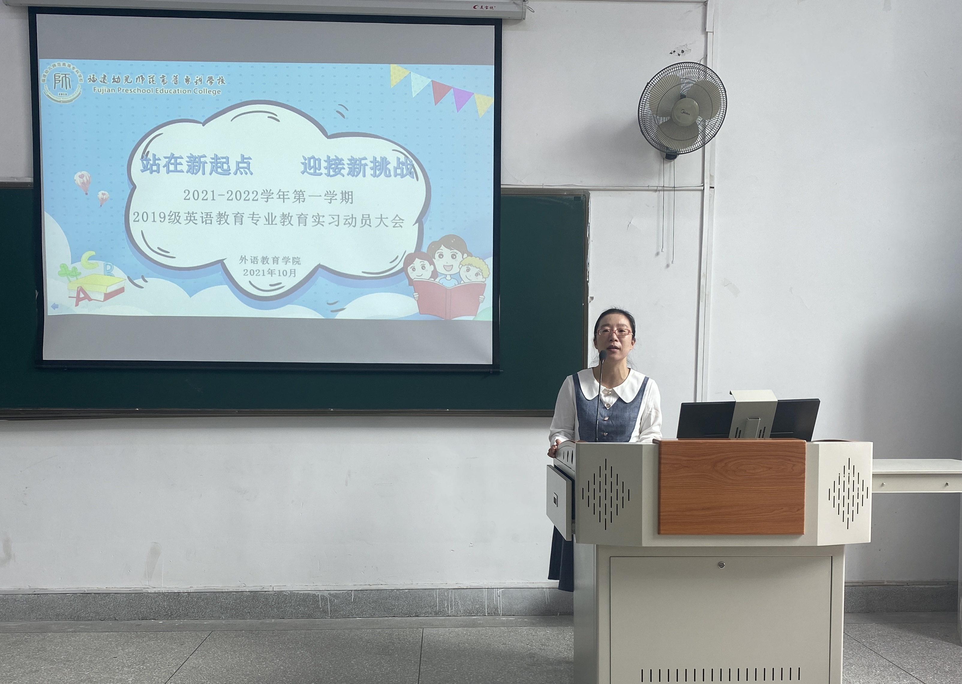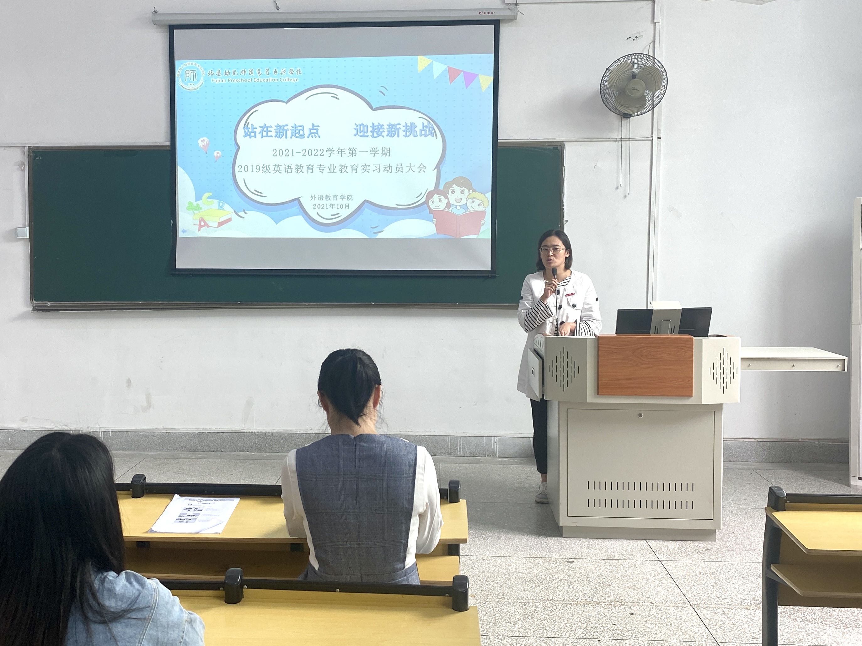 为了推进本学期校外教育实习工作的顺利开展,充分激发学生教育实习的热情,明确教育实习的要求,10月28日上午,外语教育学院2019级英语教育专业教育实习动员大会在金山校区3号楼102教室举行。会议由小学英语教研室主任胡榕主持,副院长叶一青、学院学生工作负责人何莹以及2019级英语教育专业全体学生参加此次动员大会。