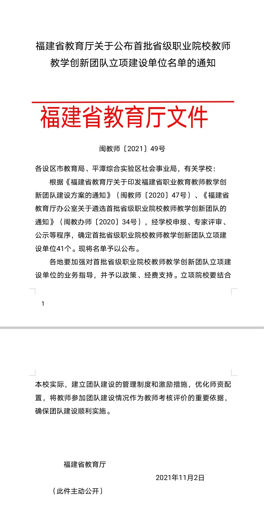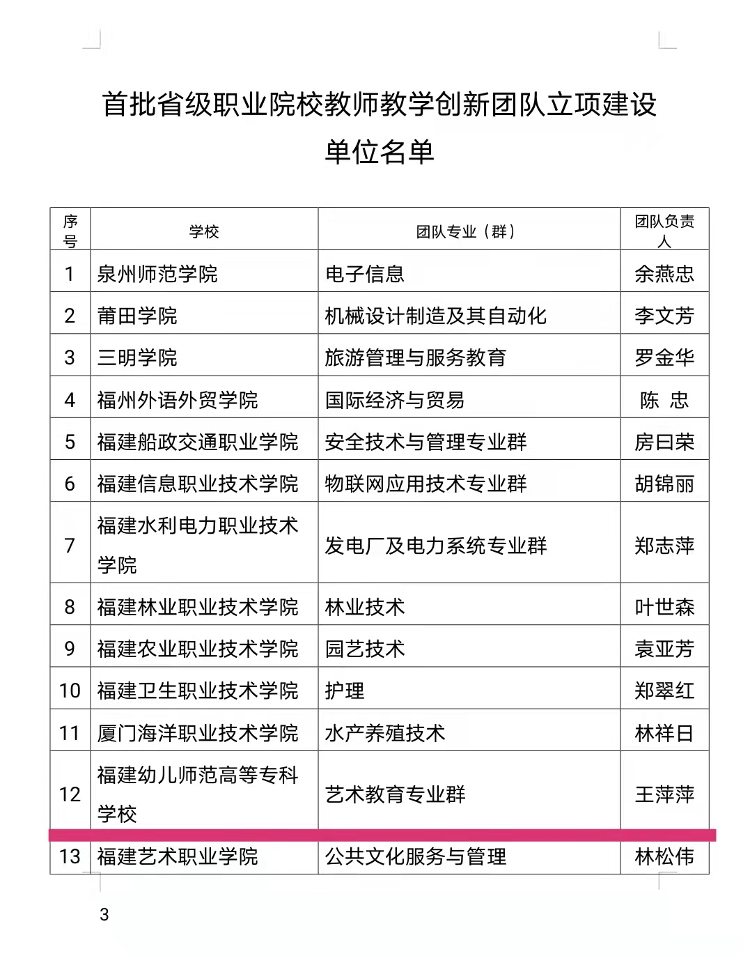 近日,福建省教育厅发布《福建省教育厅关于公布首批省级职业院校教师教学创新团队立项建设单位名单的通知》(闽教师〔2021〕49号),艺术教育学院"艺术教育专业群"团队入选首批省级职业院校教师教学创新团队立项建设单位,团队由院长王萍萍教授负责。