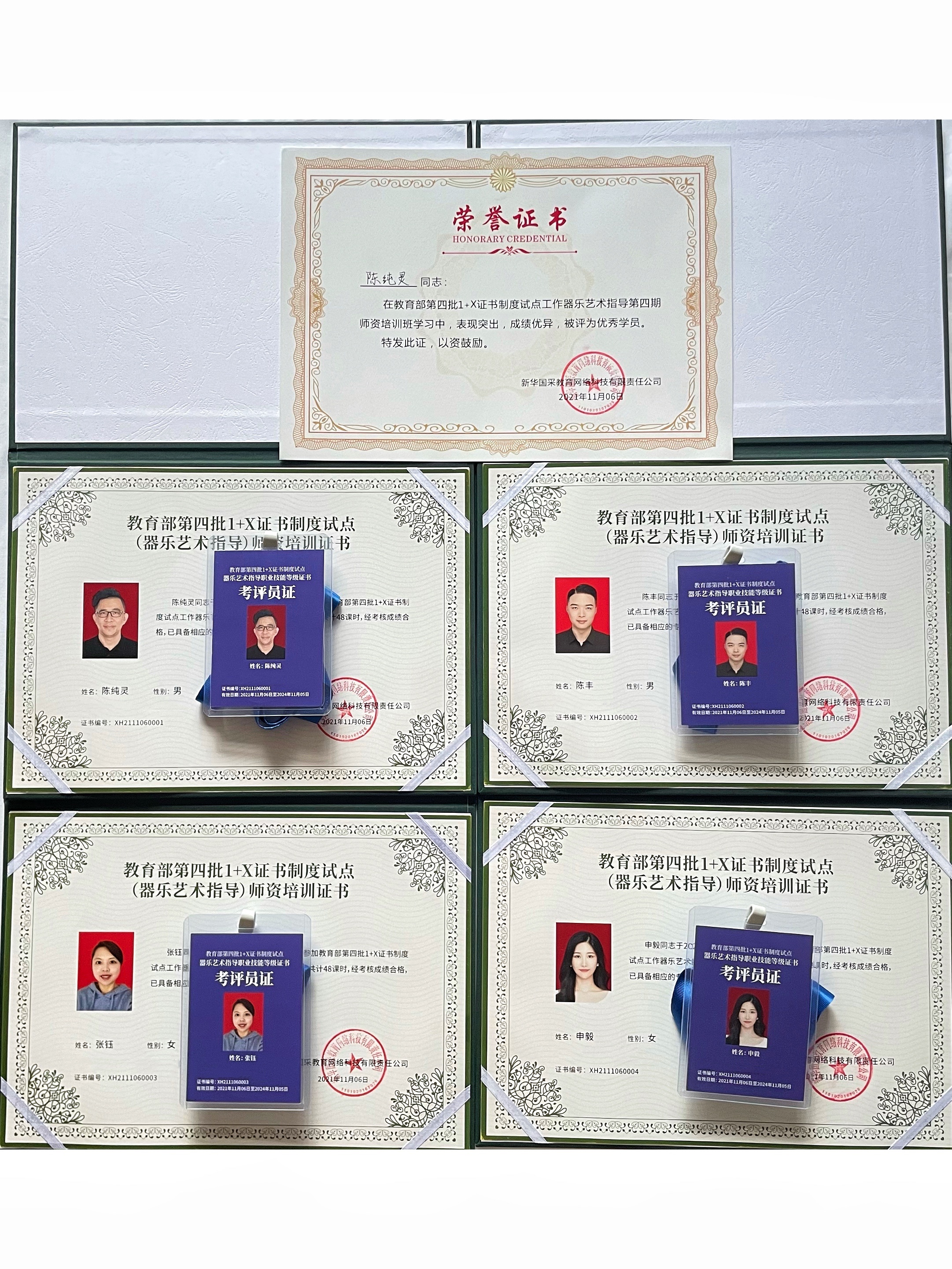 为进一步深入落实国务院印发《国家职业教育改革实施方案》(国发[2019]4号)、教育部、国家发改委、财政部、市场监管总局四部门联合印发的《关于在院校实施"学历证书+若干职业技能等级证书"制度试点方案》(教职成[2019]6号)文件精神,在学校领导与学院领导的关心和支持下,10月31-11月6日,艺术教育学院陈纯灵、陈丰、张钰、申毅四位教师前往深圳参加教育部第四批"1+X"证书制度试点(器乐艺术指导)师资培训班。四位教师经过五天紧张的学习,从器乐艺术指导标准、教育教学理念、教学规划原理及案例、器乐演奏技巧、音乐简史与教学、高效能全素养音乐启蒙教学法、考点建设及考评员事务、研讨等方面,进行了多角度、全方位的深入学习。并通过笔试、编写教案、说课、现场器乐演奏等紧张激烈的考试环节中脱颖而出,顺利结业,均获得"1+X"器乐艺术指导师资培训证书及考评员证。陈纯灵老师被评为优秀学员。