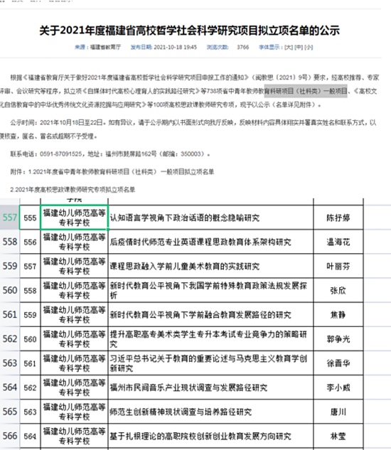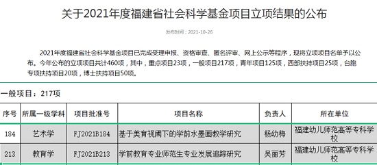日前,根据"关于2021年度福建省社会科学基金项目立项结果的公布"公示,我院吴丽芳教授、杨幼梅副教授两个项目获省社会科学基金课题立项。此次公布的2021年度福建省社会科学基金一般项目,全省高职高专仅6项,我院占了2项。同时,2021年度福建省高校哲学社会科学研究项目名单公示,我院叶丽芬、焦静、张欣三位老师申报立项成功!