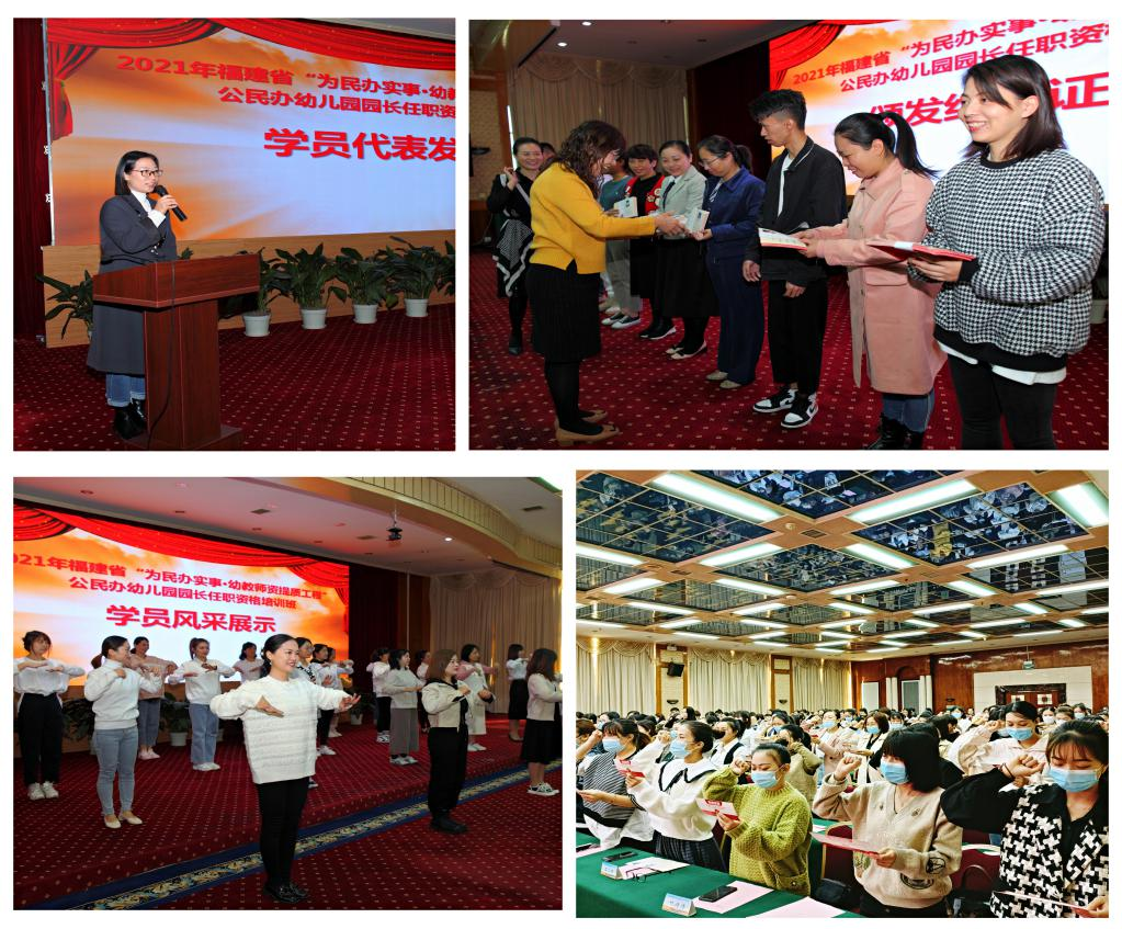 2021年11月10日,由福建省教育厅主办、福建幼儿师范高等专科学校承办的2021年福建省"为民办实事·幼教师资提质工程"——公民办幼儿园园长任职资格培训班在福州圆满结束,来自全省各地市的200多位学员顺利结业,我校陈凤玉副校长出席结业仪式并致辞,教师教育发展学院薛少红院长、副院长参加了结业仪式。