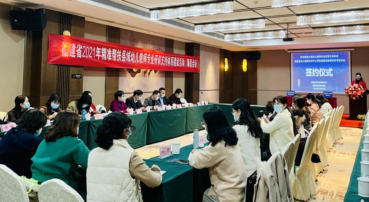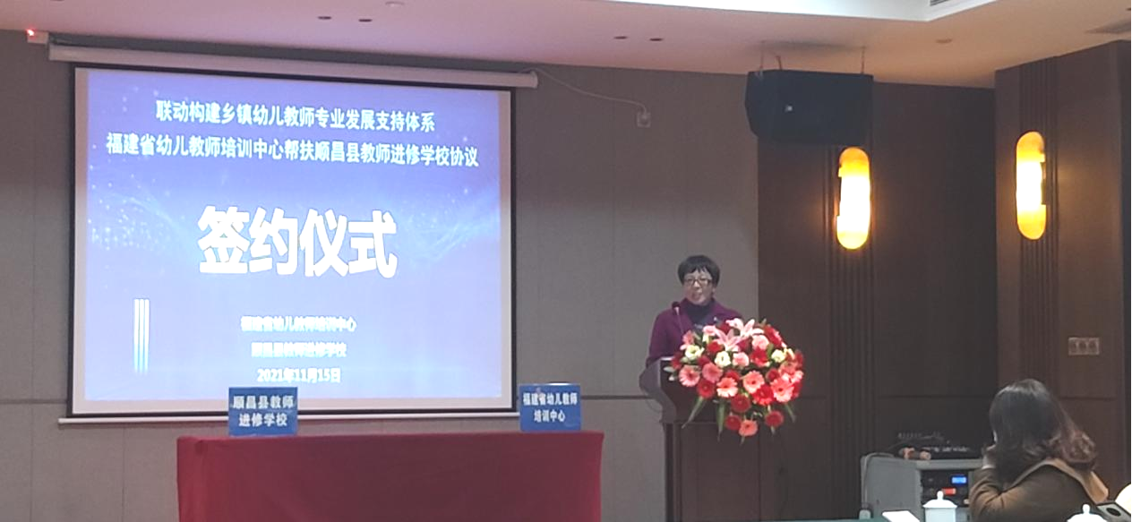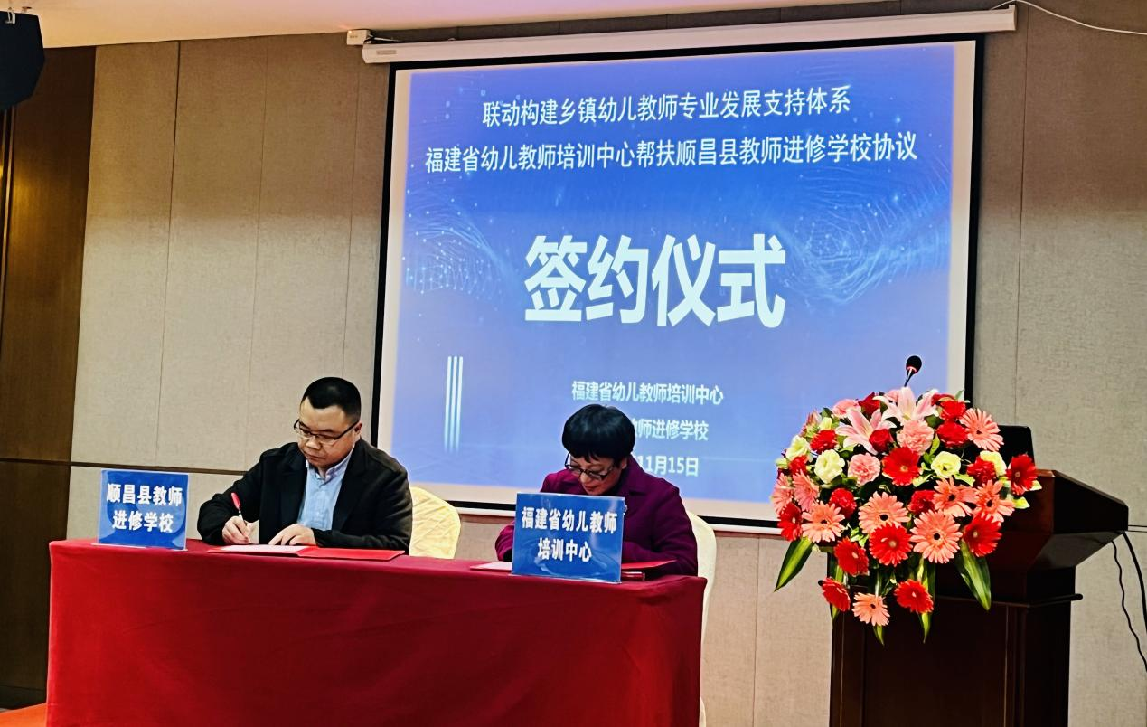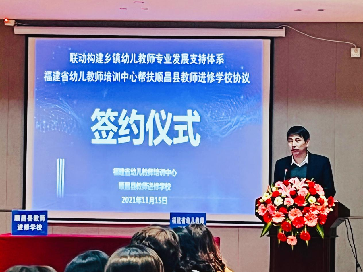 11月15日下午,福建省幼儿教师培训中心与顺昌县教师进修学校签署"联动构建乡镇幼儿教师专业发展支持体系"帮扶协议。顺昌县教育局张经政局长与夏必金副局长、顺昌县教师进修学校陈剑锋校长、福建省幼儿教师培训中心主任彭琦凡教授、我校鲍钰清与孙楠楠老师以及南平市、顺昌县两级学前教育研究指导组、顺昌县公办幼儿园园长参加了签约仪式。