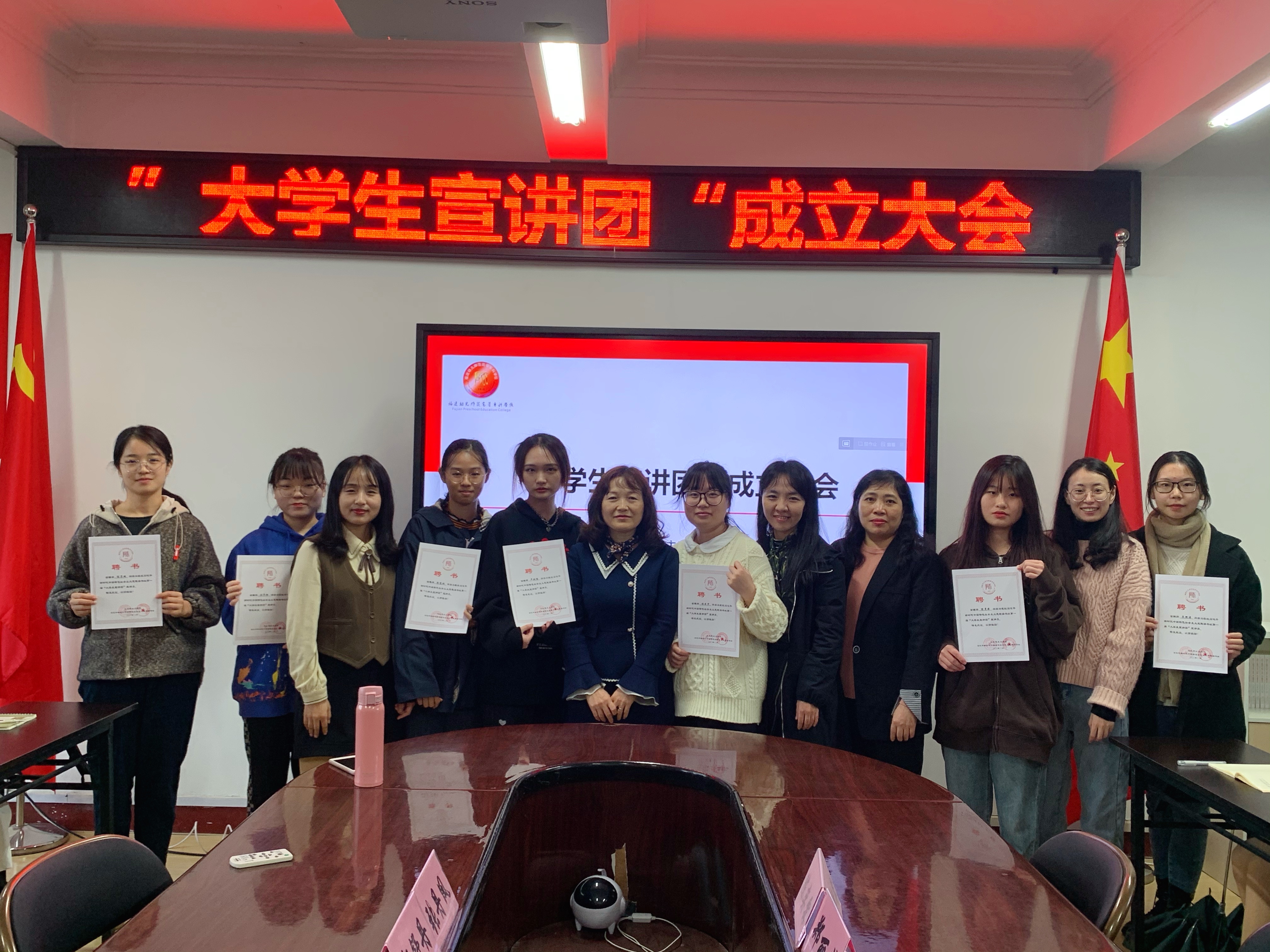 随后,读书社组织开展了大学生宣讲团成立大会。来自学前教育学院、艺术教育学院、人文科学学院、外语教育学院及信息科学学院的10位同学在学院推优与自荐参与过程中脱颖而出,成为大学生宣讲团的首批成员。马克思主义学院院长伊文婷教授为宣讲团成员颁发聘书。她勉励宣讲团成员要紧跟理论前沿、常学常新,将理论学习与实际学习生活相结合,做大学生中的理论先锋;要履职尽责,扎实做好党的最新理论的宣传宣讲工作,带领同学们博识厚学,坚定理想信念;要通过团队协作、宣讲领学形成浓厚的积极向学之风,为弘扬福幼好校风、好学风发挥重要的引领作用。