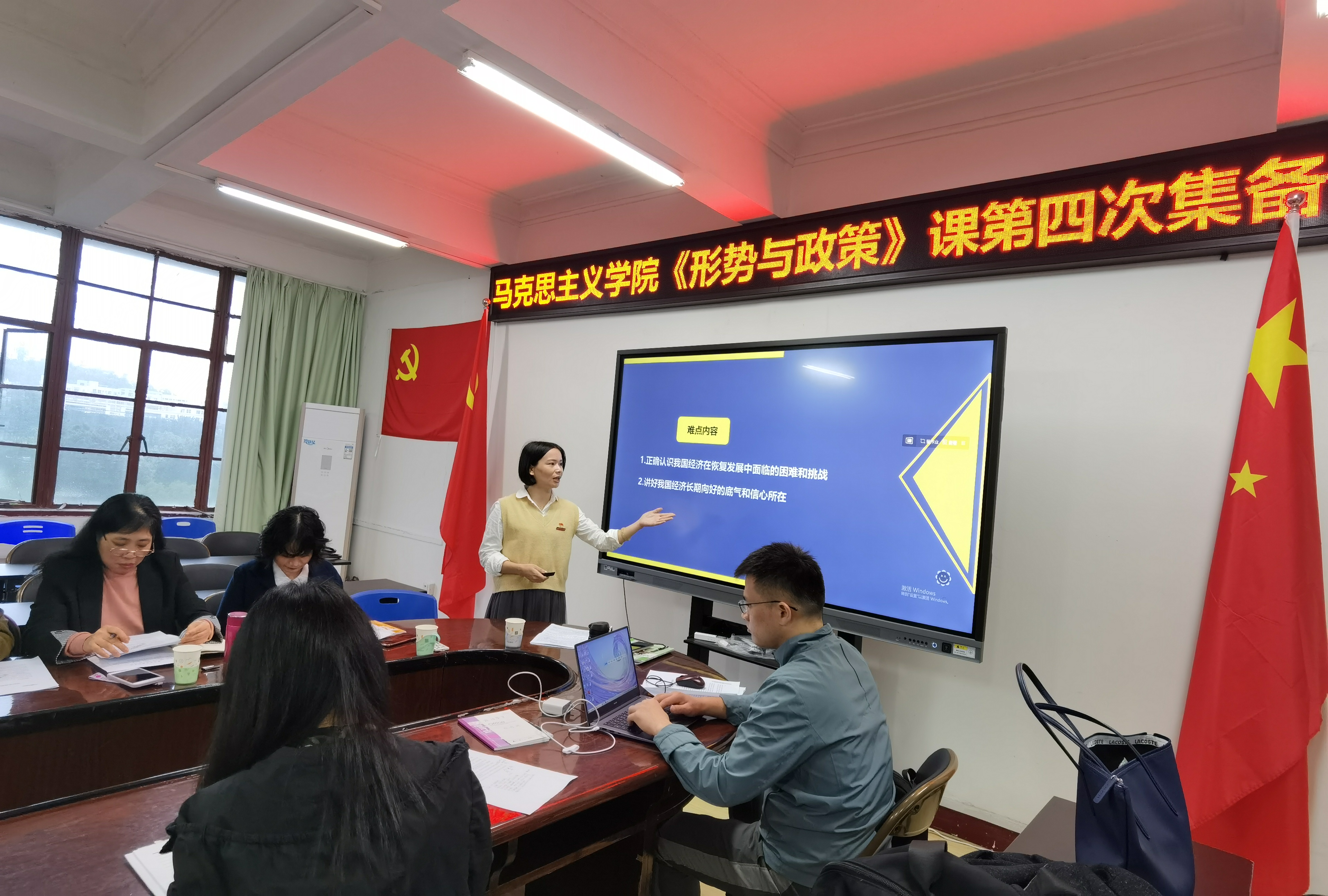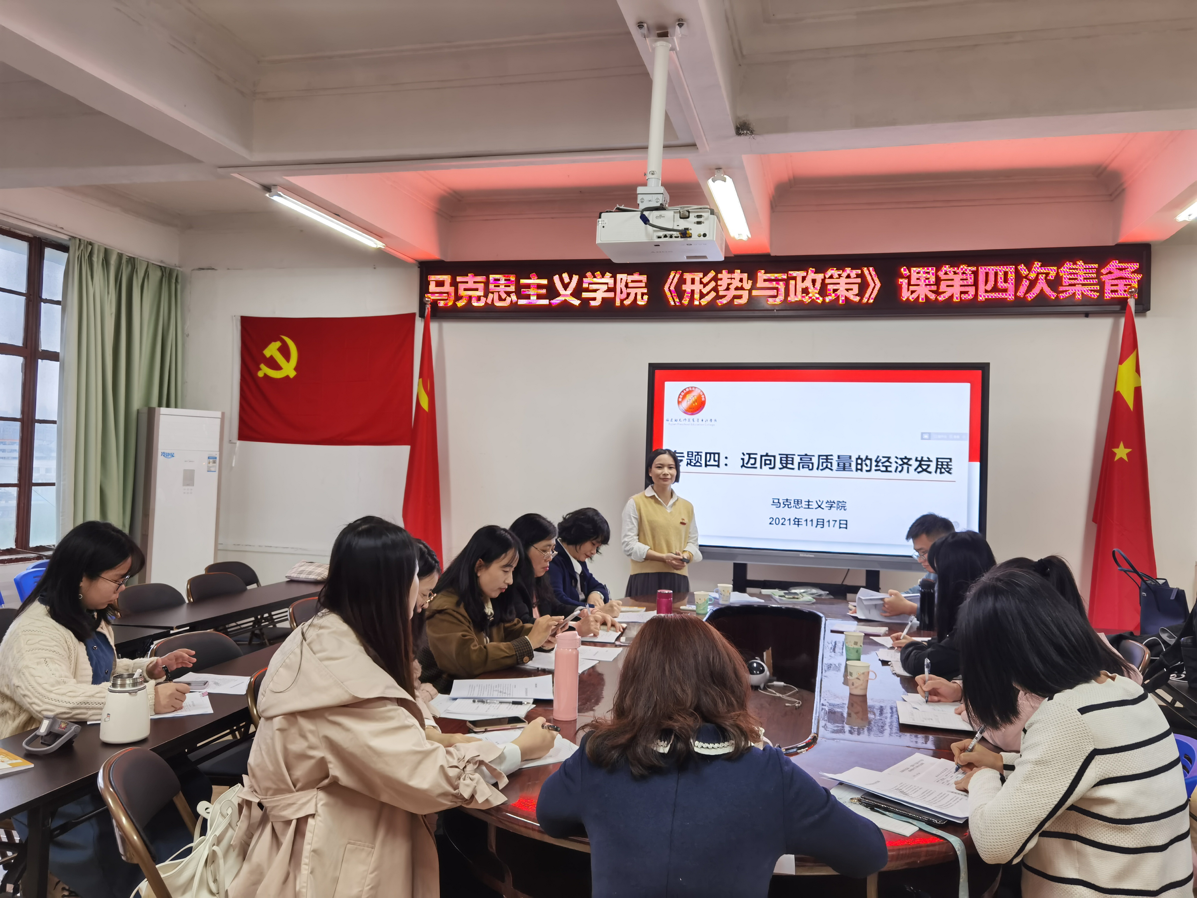 2021年11月17日下午,马克思主义学院于院办会议室开展《形势与政策》课第四次集体备课活动。此次集备由"毛泽东思想和中国特色社会主义理论"课教研室主任张丹凤副教授主讲,马院全体专任教师参加。
