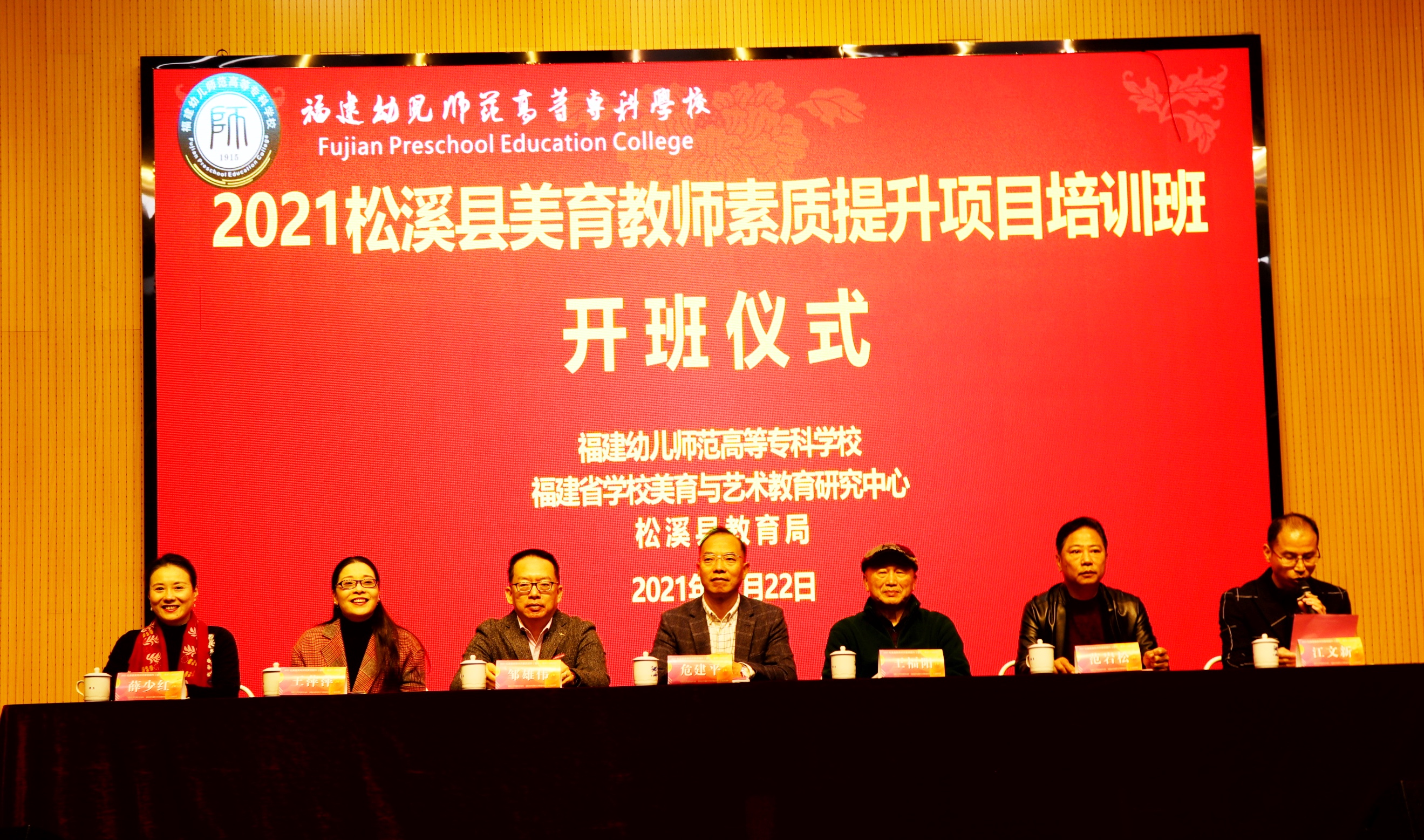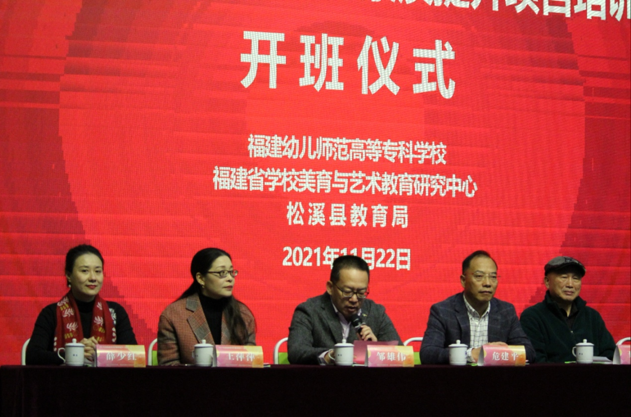 为了深入贯彻落实习近平新时代中国特色社会主义思想和党的十九届六中全会精神,贯彻落实《关于全面加强和改进新时代学校美育工作的意见》《关于开展农村学校艺术教育实验县工作的通知》等文件精神,努力办好人民满意的教育,进一步加强和改进农村艺术教育实验县工作,11月22日,"2021年松溪县美育教师素质提升项目培训班" 开班仪式和"结对子"签约揭牌仪式在南平市松溪县举办,松溪县人民政府党组成员、三级调研员危建平,松溪县教育局范岩松局长等领导,以及福建幼儿师范高等专科学校党委副书记邹雄伟、福建省学校美育与艺术教育研究中心首席专家王福阳教授、福建幼高专艺术教育学院、教师教育发展学院、创新创业与实训中心的领导老师、培训团队专家和来自松溪县的80多位美育教师参加此次活动,活动由松溪县教育局江文新副局长主持。本次签约仪式及培训活动由福建幼儿师范高等专科学校、福建省学校美育与艺术教育研究中心与松溪县教育局联合主办,由松溪县普教室、松航小学、东门幼儿园等单位联合承办。