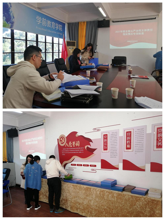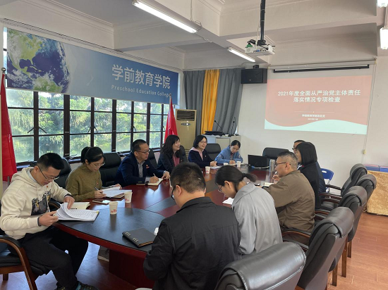 11月24日上午,校党委副书记委邹雄伟带领校纪委、组统部、宣传部、党政办四部门人员莅临学前教育学院开展2021年全面从严治党主体责任落实情况专项检查。