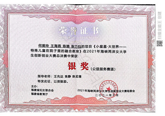 近日,2021年海峡两岸女大学生创新创业大赛决赛在厦门落下帷幕。经过激烈角逐,我院何美玲、王海燕、陈璐和张巧钰同学在王先达、焦静、陈孟增老师的指导下,从全省1572个参赛项目中仅有49个项目获奖情况下脱颖而出取得优异的成绩,参赛项目《小星星˙大世界——特殊儿童在院子里的融合教育》荣获公益服务赛道银奖。这也是我院持续不断加强党建引领,高度重视思政教育,专创融合,有力聚焦创新创业取得的又一突出成果,充分展现了我院学子在福建科技自立自强新征程中展现巾帼青春力量和风采。