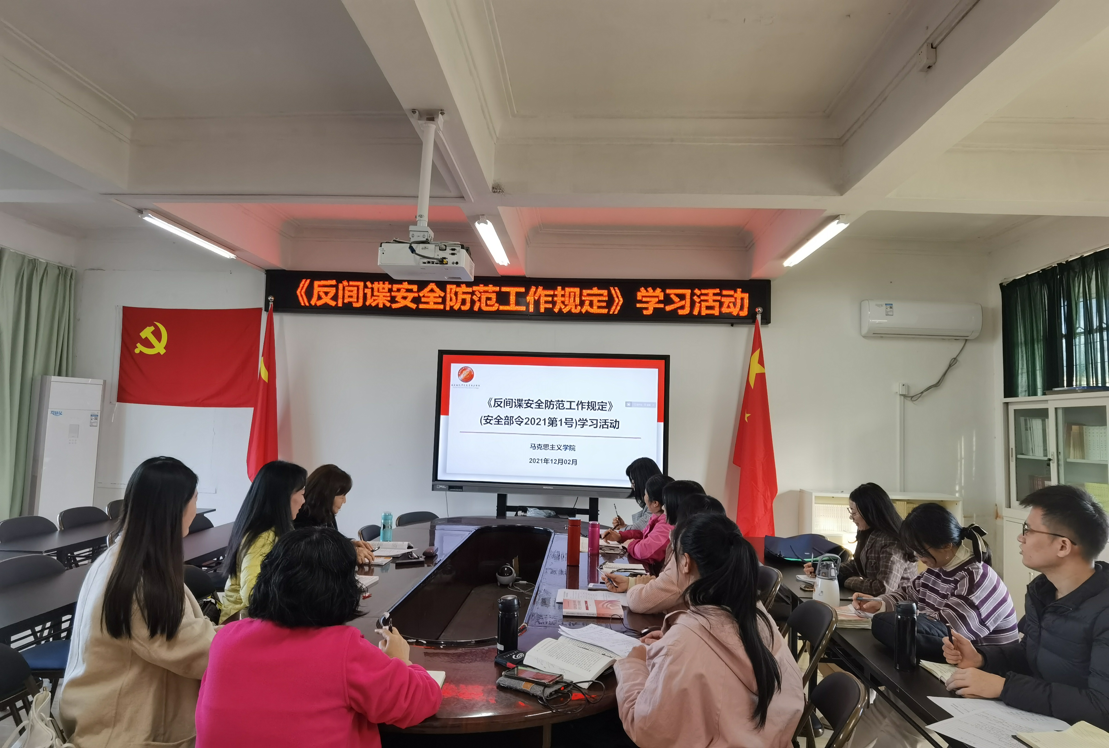 为进一步增强国家安全防范意识和能力,提高政治敏锐性和警惕性,2021年12月1日下午,马克思主义学院组织全体党员教师于院办会议室组织学习《反间谍安全防范工作规定》。本次学习活动由潘昭慧老师主讲。