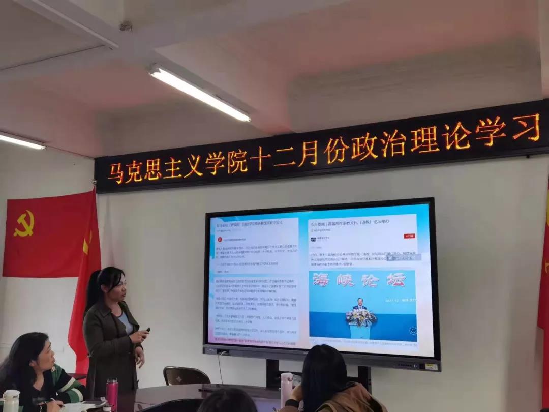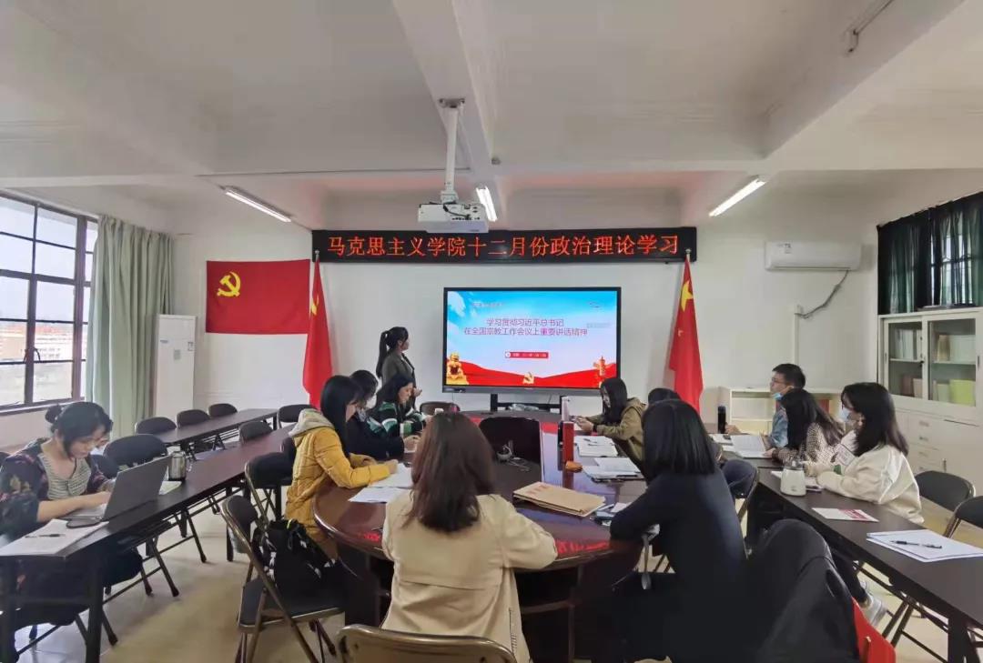 12月15日下午,马克思主义学院全体党员教师在院办601开展意识形态专题学习,由高雯婷教师作"学习贯彻习近平总书记在全国宗教工作会议上重要讲话精神"报告。