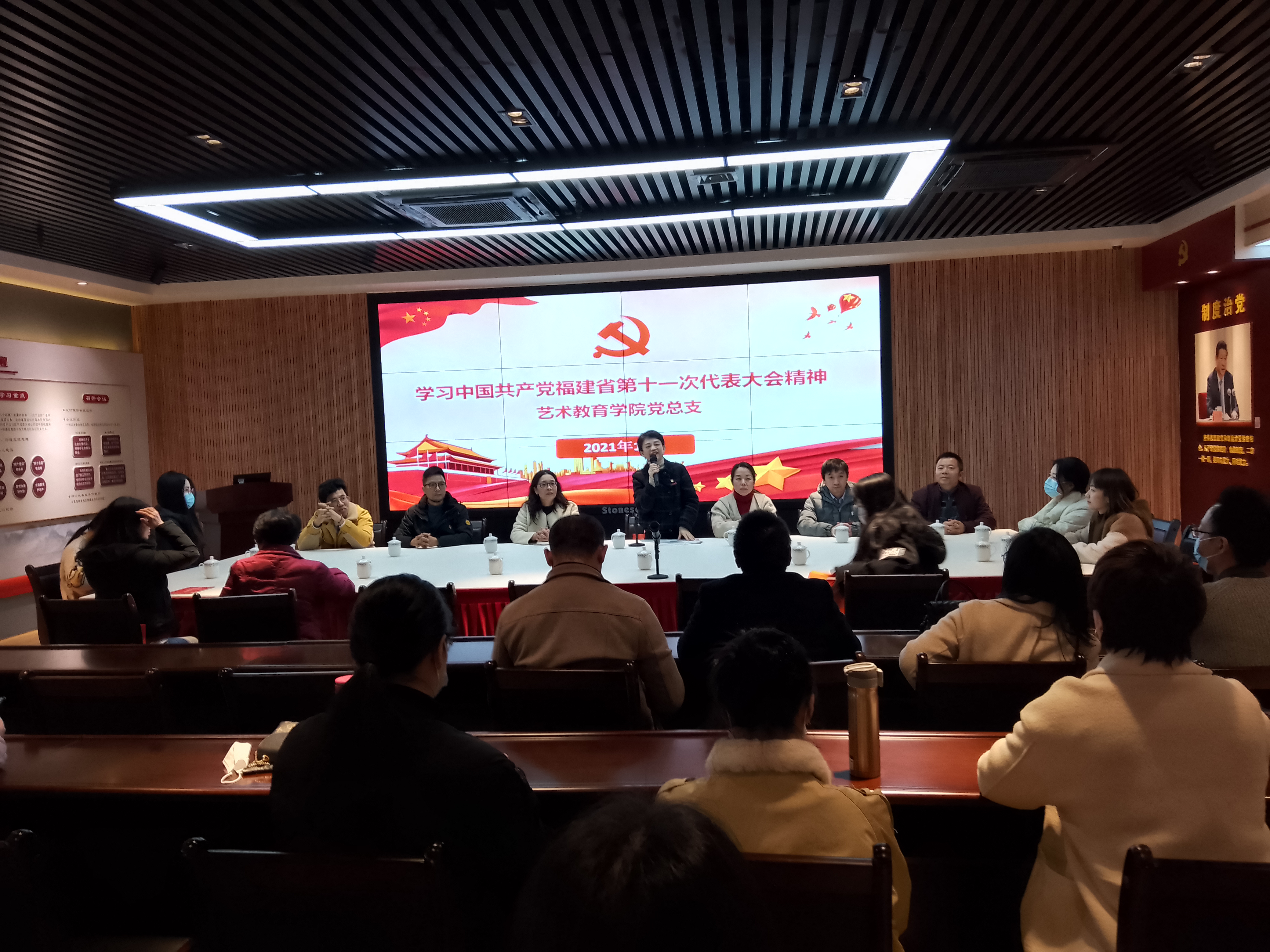 观展之后,学院党总支书记姜琪带领全体党员学习中国共产党福建省第十一次代表大会精神。会议强调,中国共产党福建省第十一次代表大会是在我们党成立一百周年,向建设社会主义现代化强国和实现中华民族伟大复兴的第二个百年奋斗目标迈进的重要时刻召开的一次十分重要的大会,是全省人民政治生活中的一件大事。我们要坚持党的教育方针,努力办好人民满意的教育,时刻以党员的标准严格要求自己,时刻以党员的先进性鞭策激励自己,积极探索"双减"政策背景下我院的办学和人才培养方向,为推动艺术教育学院更好更快发展贡献力量。