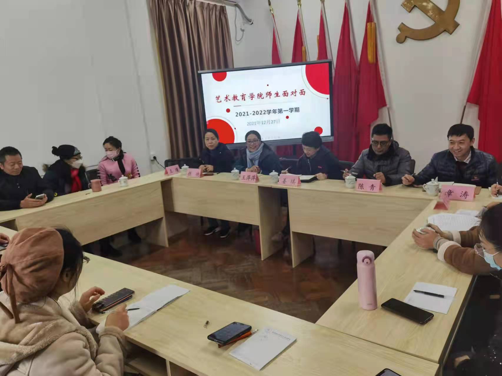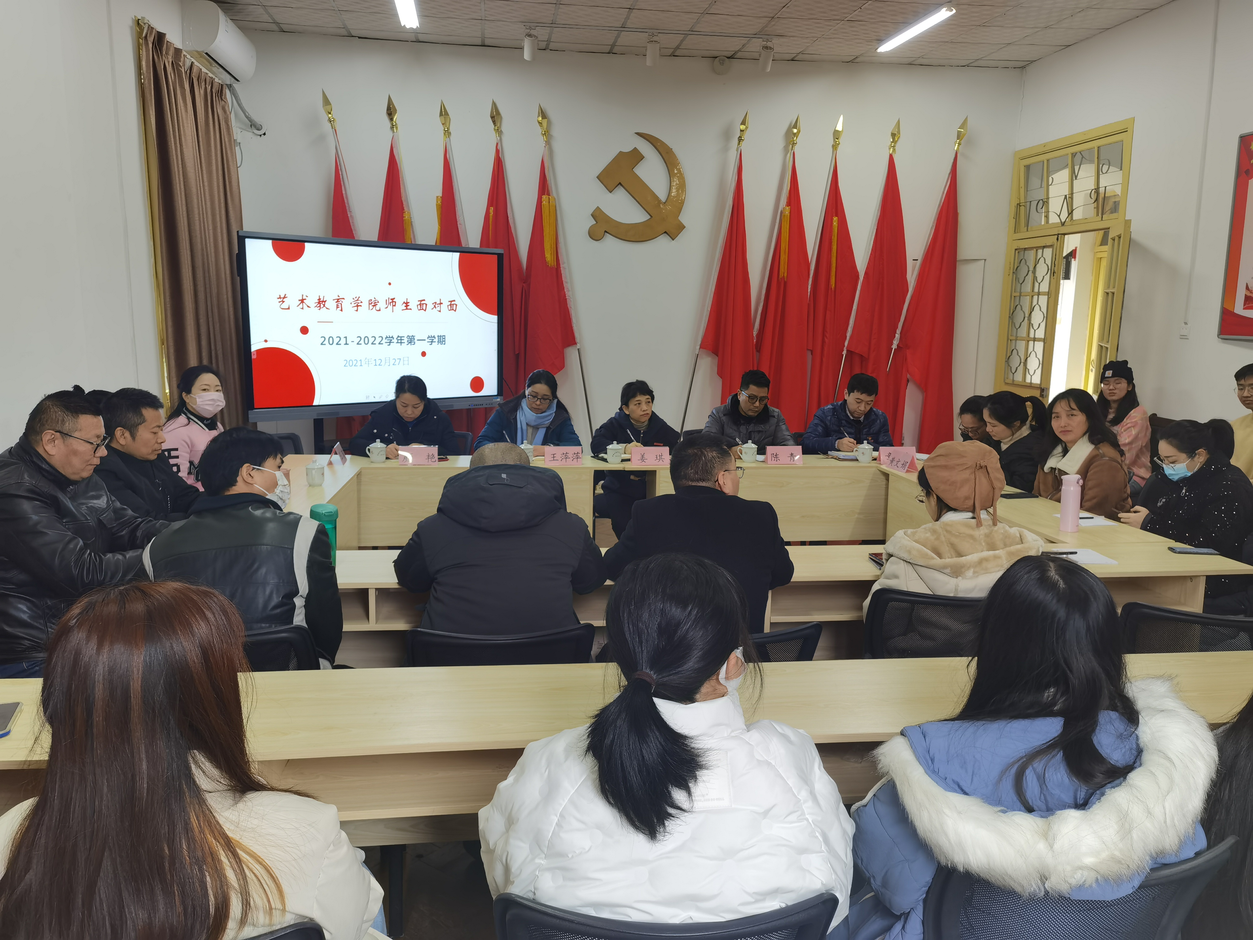 为贯彻落实学校党委的部署,落实落细"我为师生办实事"的工作,2021年12月27日,2021-2022学年第一学期艺术教育学院师生面对面座谈会暨教学督导工作会议在行政楼215会议室进行。学院院长王萍萍、党总支书记姜琪、副院长陈青、颜艳,学校创新创业与实训中心副主任、学院学生科科长章涛,学院二级督导、各教研室主任和辅导员,以及各班学生代表参加会议。