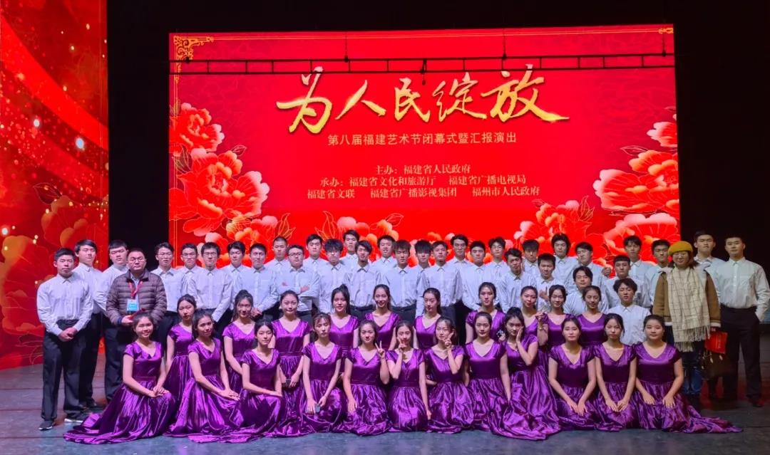 由福建省人民政府主办的第八届福建艺术节于12月13日至12月30日在福州举行。福建艺术节是我省规格最高、规模最大的综合性文化艺术创作演出展示活动,每三年举办一届。本届艺术节以"办艺术盛会,展时代风采"为主题,秉承"艺术的盛会,人民的节日"办节宗旨,体现文化惠民,让广大群众有更多获得感。活动由省文旅厅、广电局、文联、广播影视集团和福州市人民政府等承办,主要有开幕式和闭幕式、专业艺术活动、群众文化活动、文化艺术展览活动、闽台文化交流活动和旅游演艺展示等五大系列活动,参演作品包含现实题材、红色革命题材、新编历史题材、传统文化题材、福建特色题材等。我校受邀参与其中两场重要的演出活动。