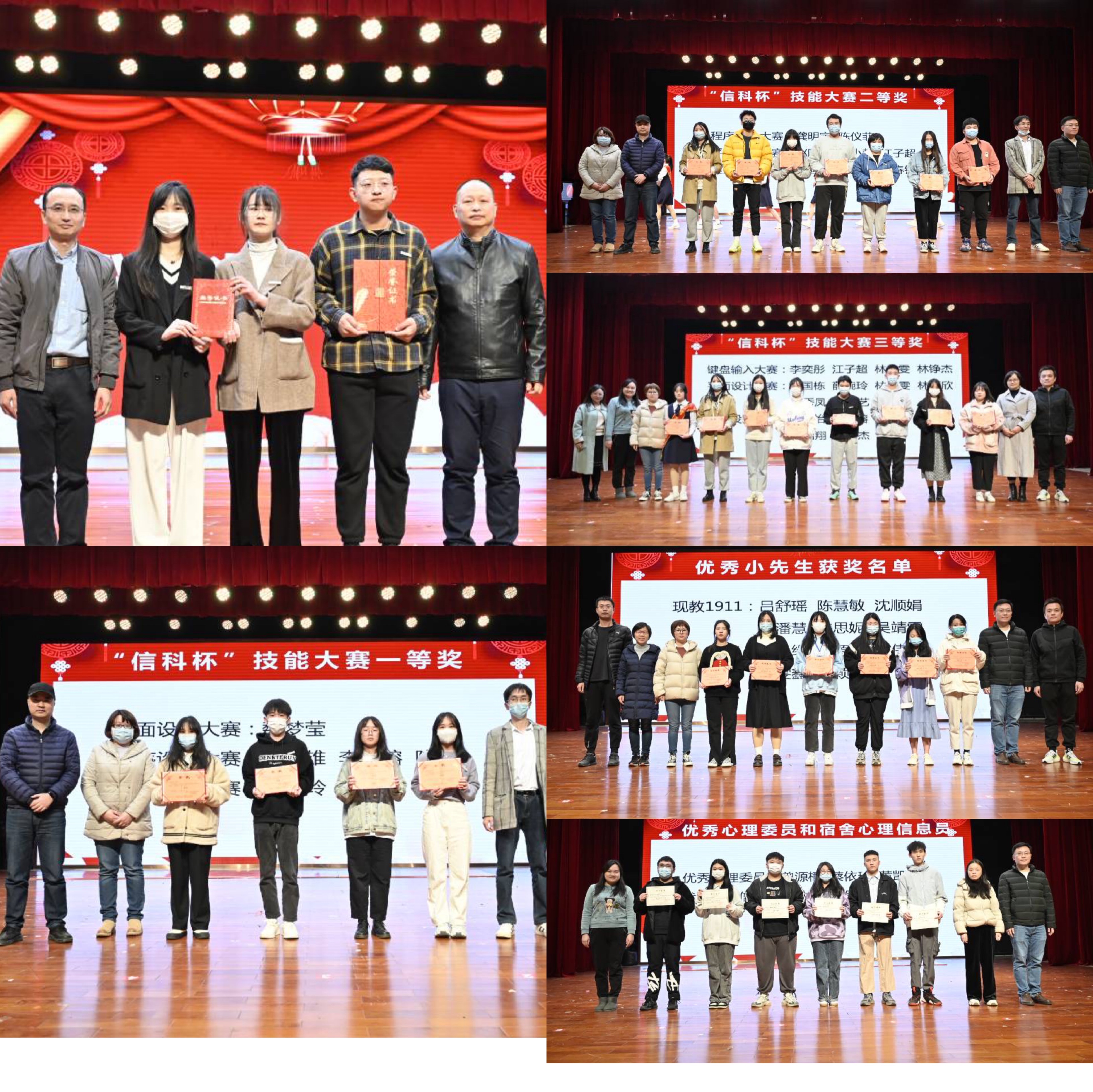 即将过去的一个学期里,同学们不断成长的同时也伴随着满满的收获。陈宁华院长、余深焰书记、刘建炜副院长以及与会的学院老师对国家奖学金、国家励志奖学金、福建省职业院校技能大赛、"信科杯"技能大赛、"优秀指导员"(小先生)、优秀心理委员、心理信息员、学校各等级奖学金、先进班级获得者和集体进行颁奖表彰。