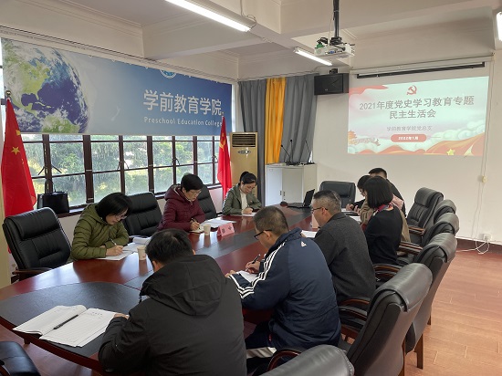 1月15日下午,学前教育学院党总支召开2021年度党史学习教育专题民主生活会,校党委副书记、校长陈峰,校党政办副主任刘舒敏、组织统战部副部长瞿欢欢到会指导,学前教育学院全体总支委员参加,总支书记王标主持会议。
