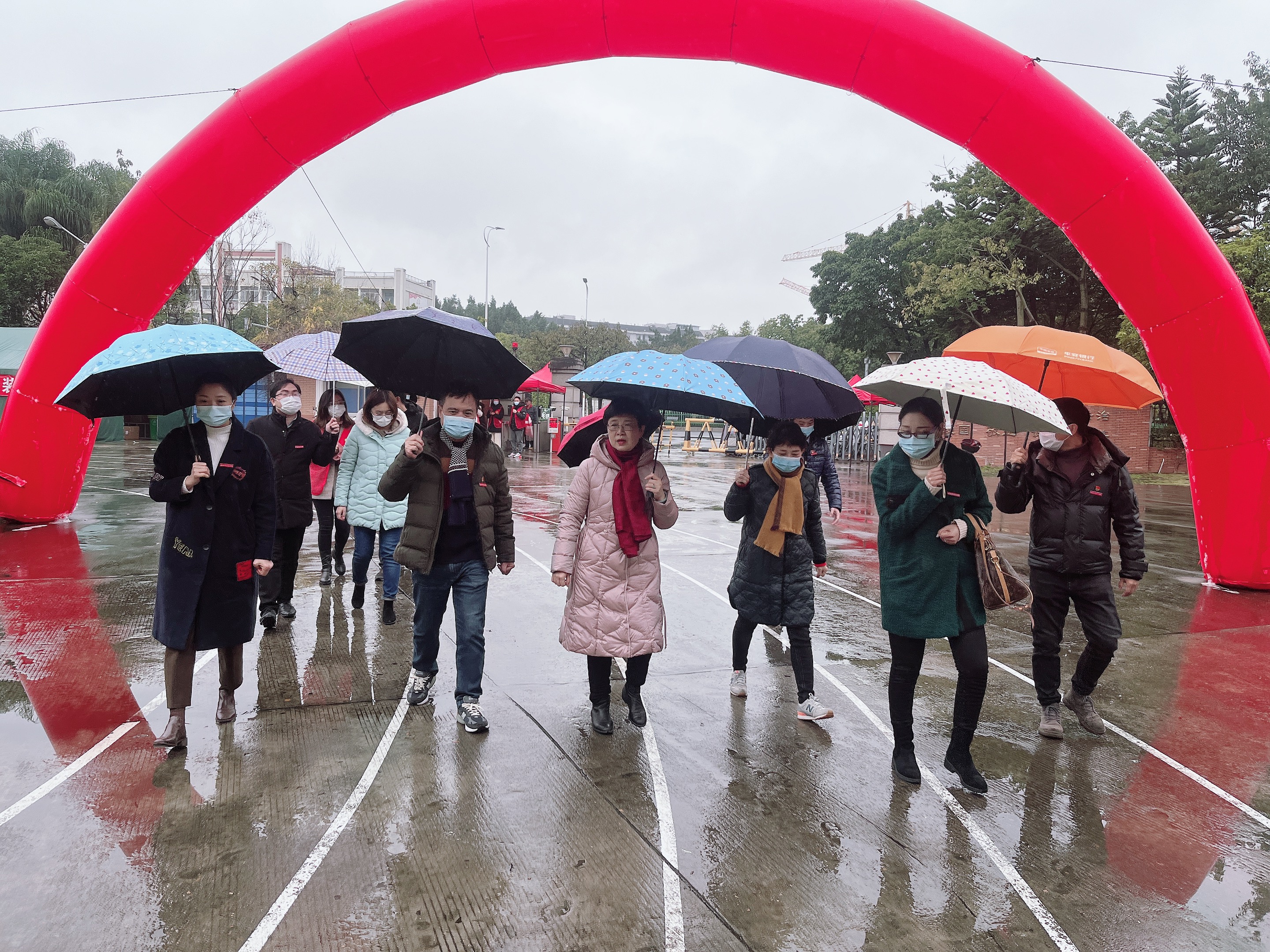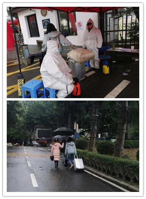 同学们在校门口检测体温、核验健康码、行程码、核酸报告,最后行李箱消毒。虽然下着雨,返校流程有条不紊进行着。