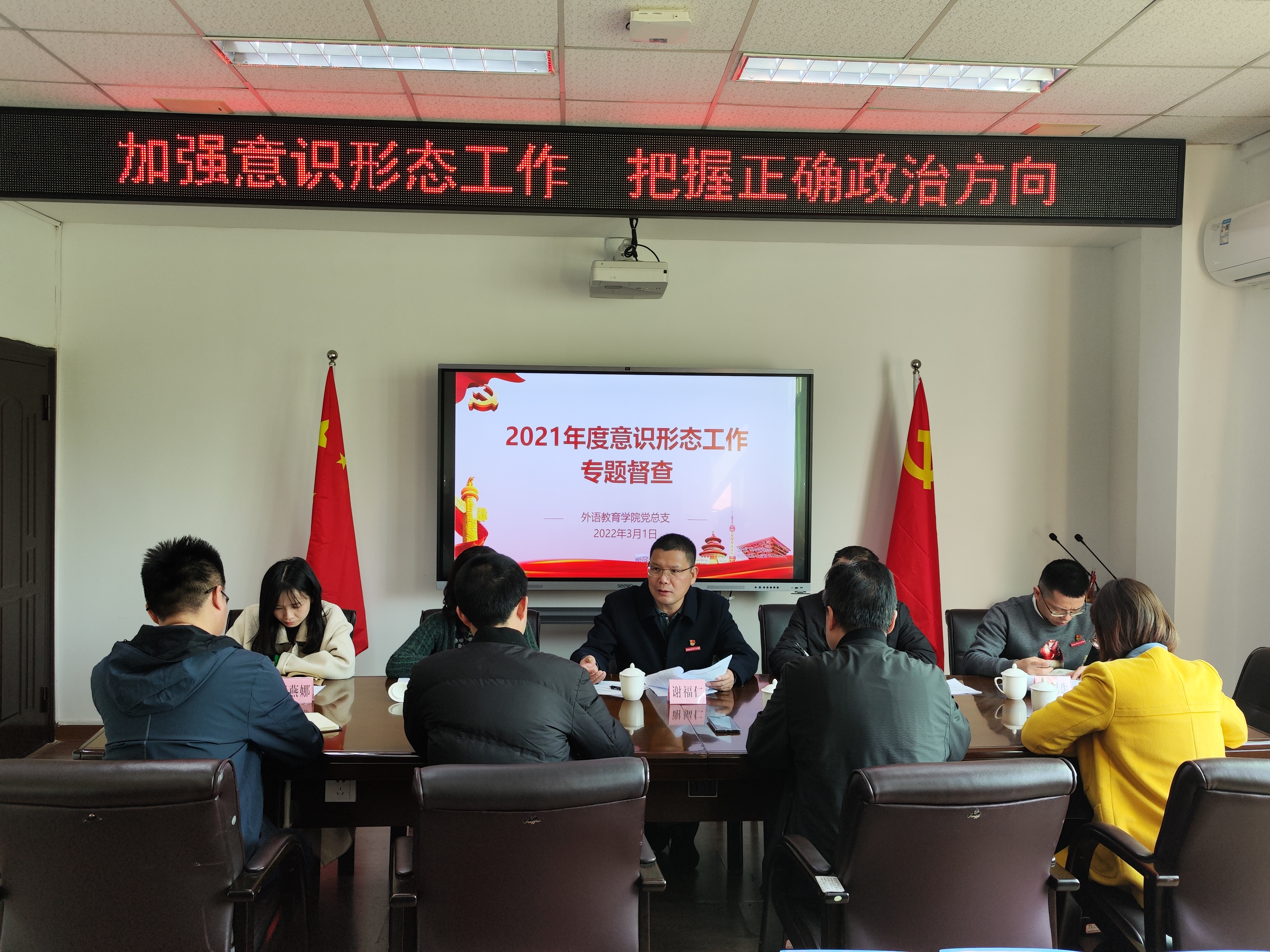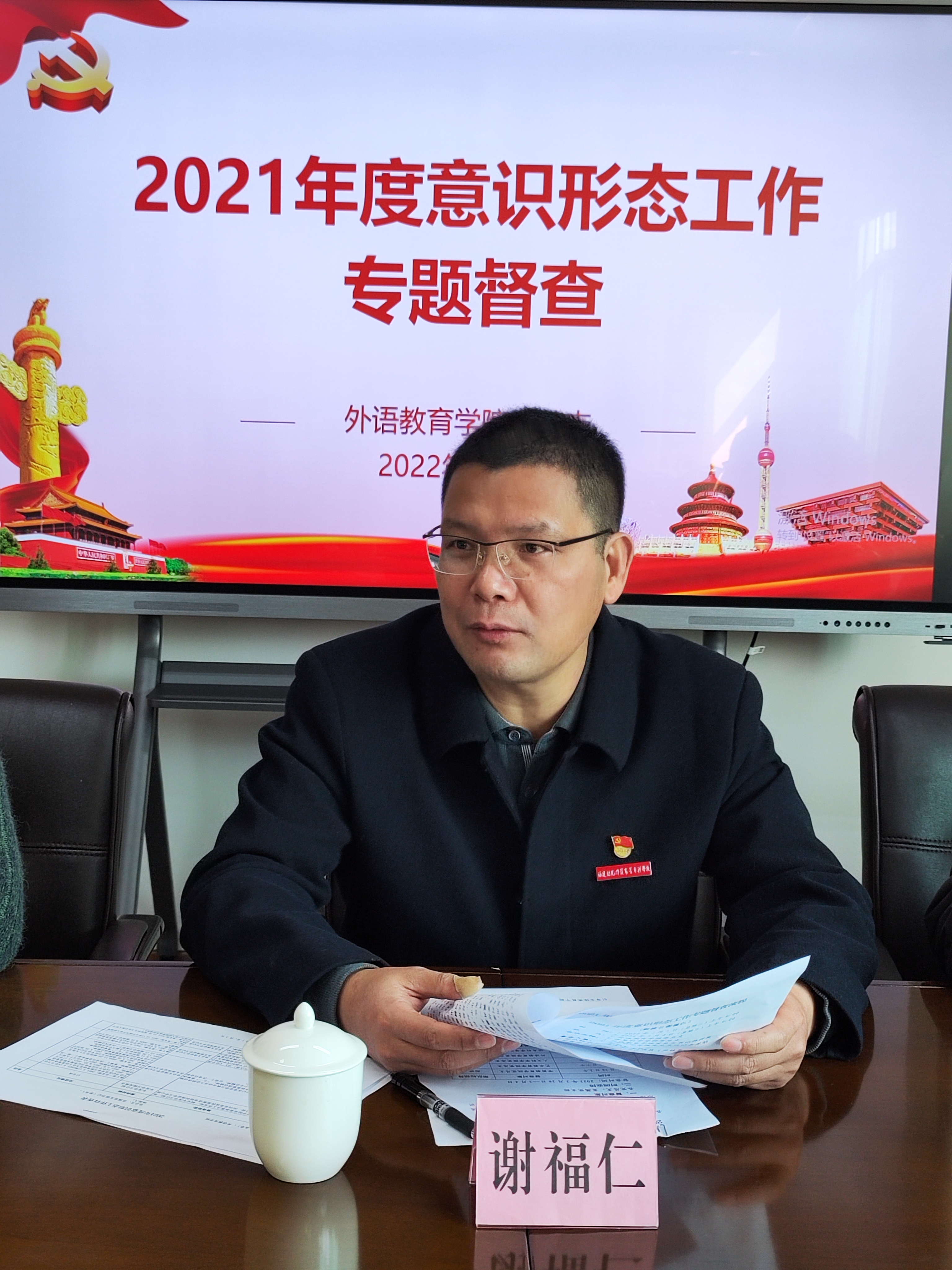 3月1日上午,校党委委员、副校长谢福仁带领检查组莅临外语教育学院开展2021年度意识形态工作专题督查,党委宣传部部长严桂泉陪同检查,外语教育学院党政班子参加会议。
