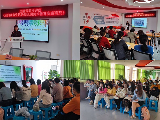 吴丽芳教授还借着走访机会,发挥专业优势服务社会,给到场的60几位莆田市幼儿园教师作题为《回归儿童生活的幼儿园美术教育实践研究》讲座,为促进莆田市学前教育师资高质量发展贡献力量。