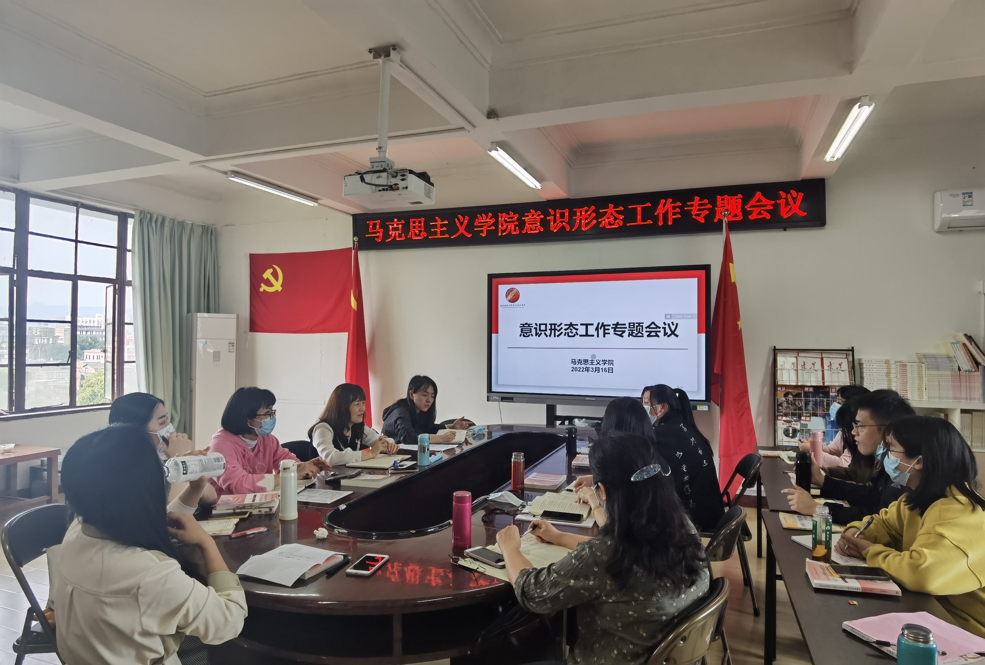 为进一步落实意识形态工作责任制,巩固马克思主义在意识形态领域的指导地位,2022年3月16日下午,马克思主义学院于学院会议室601召开意识形态工作专题会议。会议由伊文婷书记主持,全体教师参加。