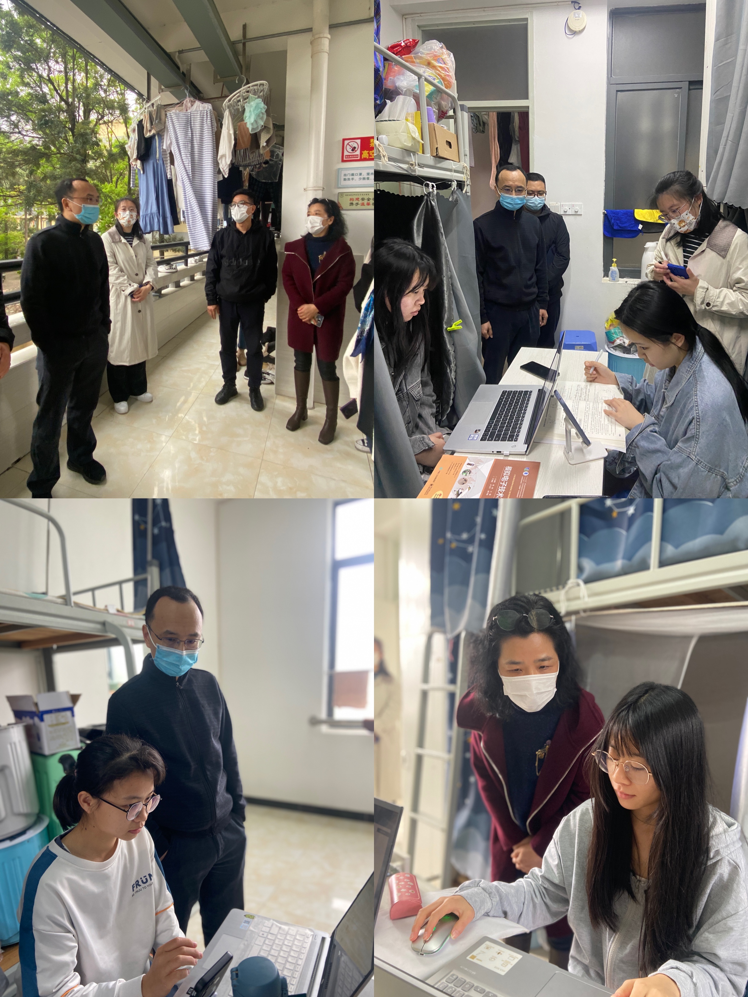 信息科学学院陈宁华院长首先抽查线上平台上课情况,接着与教务处领导一起深入学生宿舍巡查学生线上学习和生活。巡课中,教务处曾群副处长亲切询问学生网络通畅度及线上上课适应情况,同时就线上教学实施问题与陈宁华院长交流探讨。陈宁华院长也对学生线上上课提出要求,希望同学们严格遵守学校疫情防控工作要求,安排好作息时间,调整好学习状态,尽快适应线上教学学习生活。