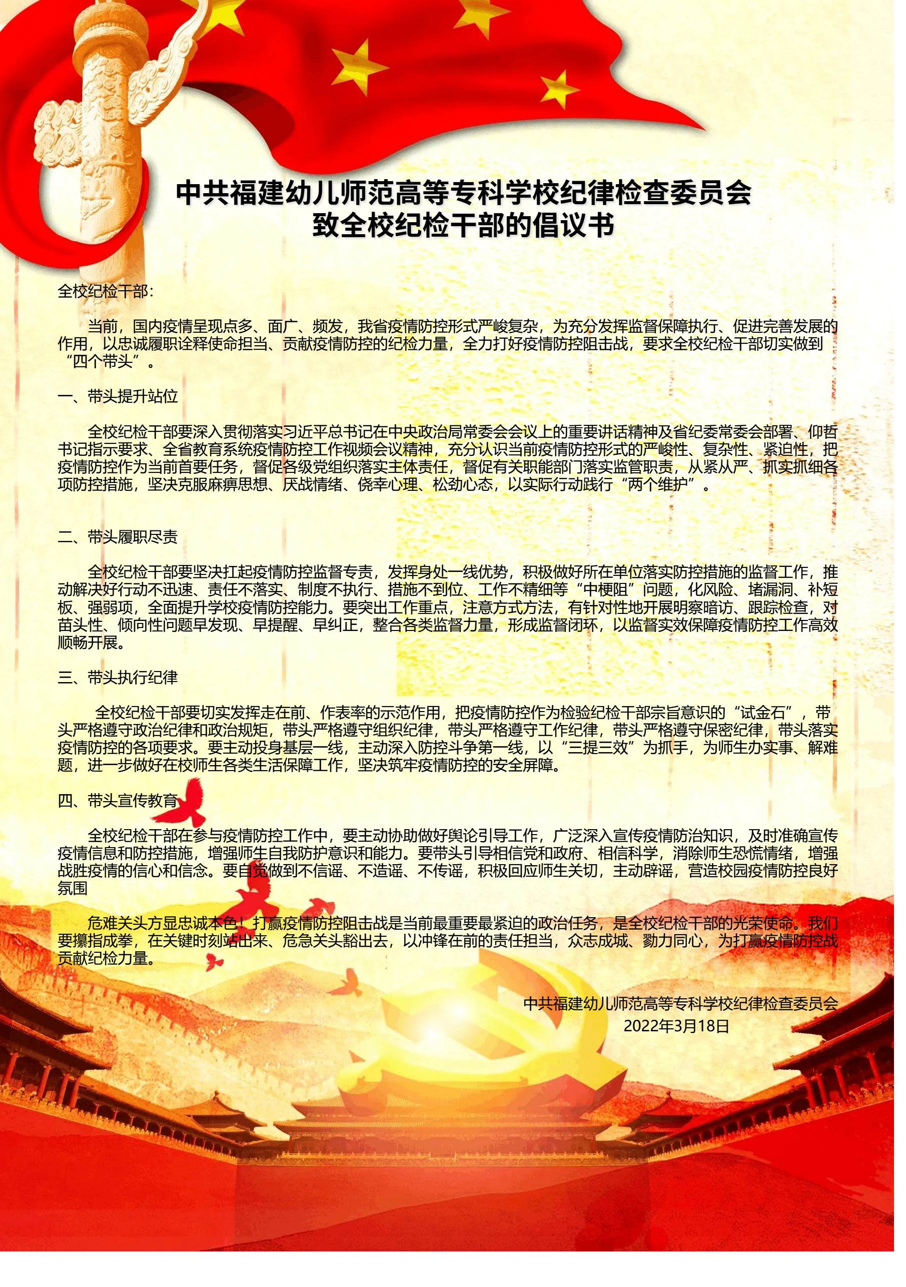 中共福建幼儿师范高等专科学校纪律检查委员会致全校纪检干部的倡议书