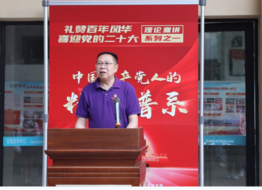 启动仪式后,学生第一党支部书记王艳如介绍了"中国共产党人精神谱系"理论宣讲活动的开展情况,宣讲团成员分别围绕 "建党精神""长征精神"等九个精神做现场解说。校领导全程聆听了宣讲,对本次活动创新方式方法给予充分肯定,对学生宣讲员的出色表现给予高度评价,希望全体师生要以本次理论宣讲活动为契机,大力发扬红色传统,传承红色基因,赓续中国共产党人精神血脉,鼓起迈进新征程、奋进新时代的精气神,以优异的成绩迎接党的二十大胜利召开!