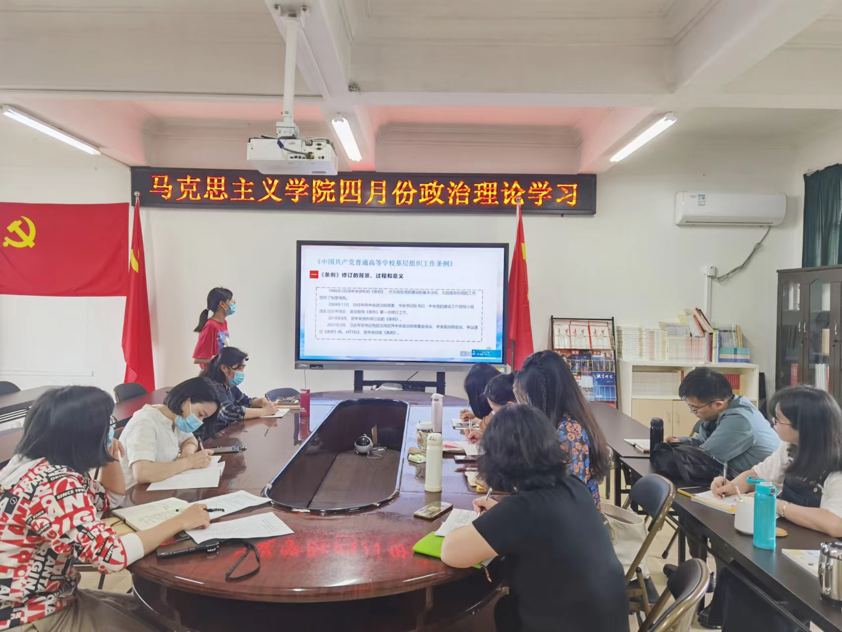 4月27日下午,马院党支部在学院会议室开展《中国共产党普通高等学校基层组织工作条例》学习交流活动。支部全体党员教师参与学习,此次学习由马院教师李缀主讲。