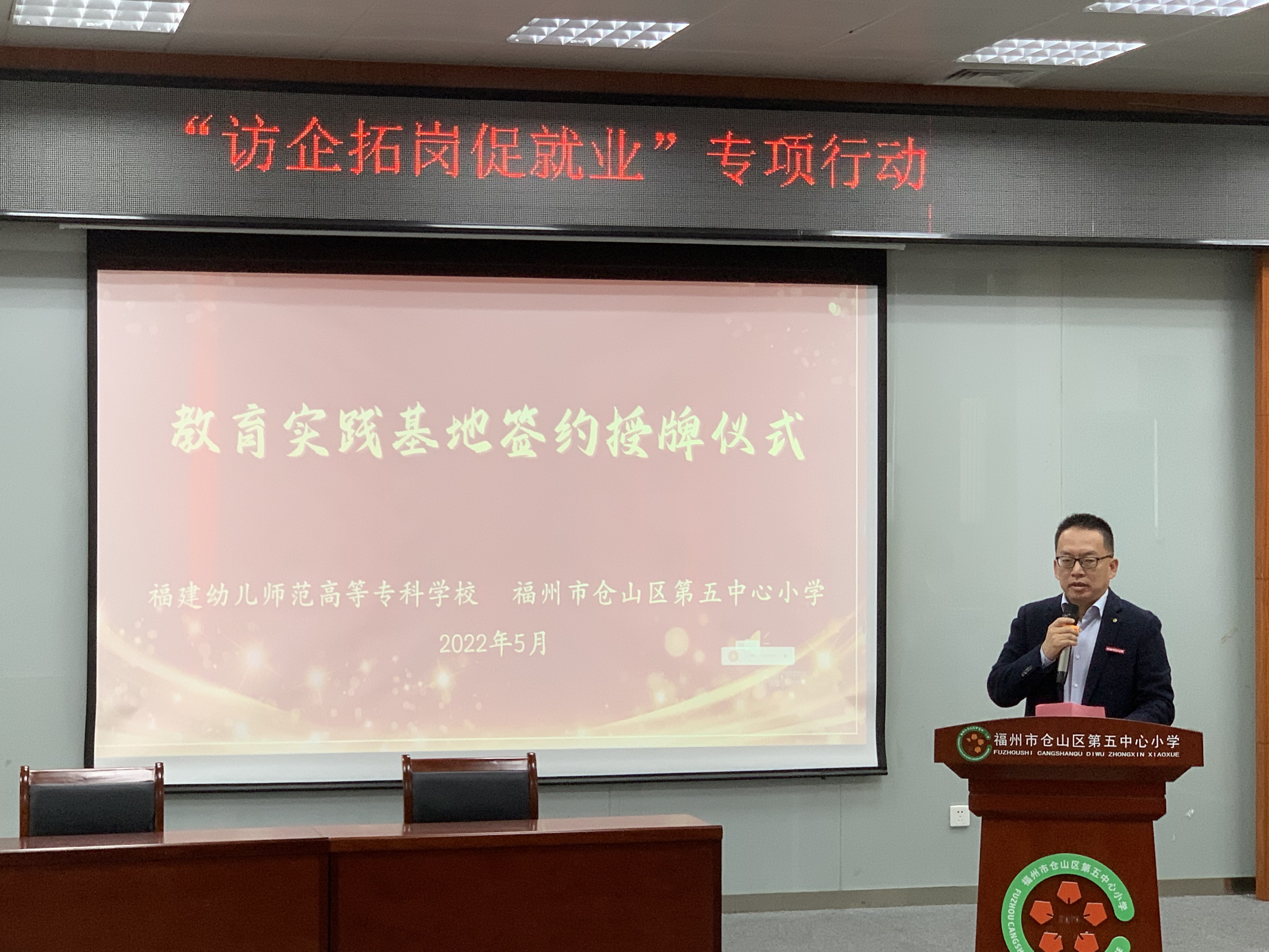 为进一步贯彻立德树人根本要求,创新实践育人工作,加强教育实践基地建设,充分发挥高校与实践基地相结合的优势,形成实践育人合力,促进毕业生高质量就业,2022年5月18日,校党委副书记邹雄伟带领外语教育学院赴福州市仓山区第五中心小学开展教育实践基地签约授牌仪式暨"访企拓岗促就业"专项行动。