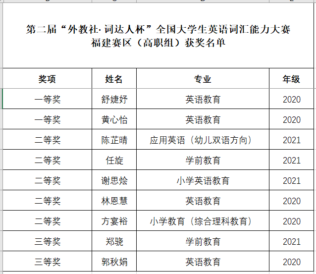 2022年5月21日,由中国外语战略研究中心、中国外语教材与教法研究中心、上海外语教育研究出版社联合主办的第二届"外教社· 词达人杯"全国大学生英语词汇能力大赛(福建赛区)比赛落下帷幕。外语教育学院、福建儿童英语教育研究中心承办了我校选拔赛。大赛旨在满足高校英语教学需求和课程思政建设需要,激发大学生英语学习兴趣,推动英语词汇学习和测试手段创新,提升大学英语智慧化教学水平。