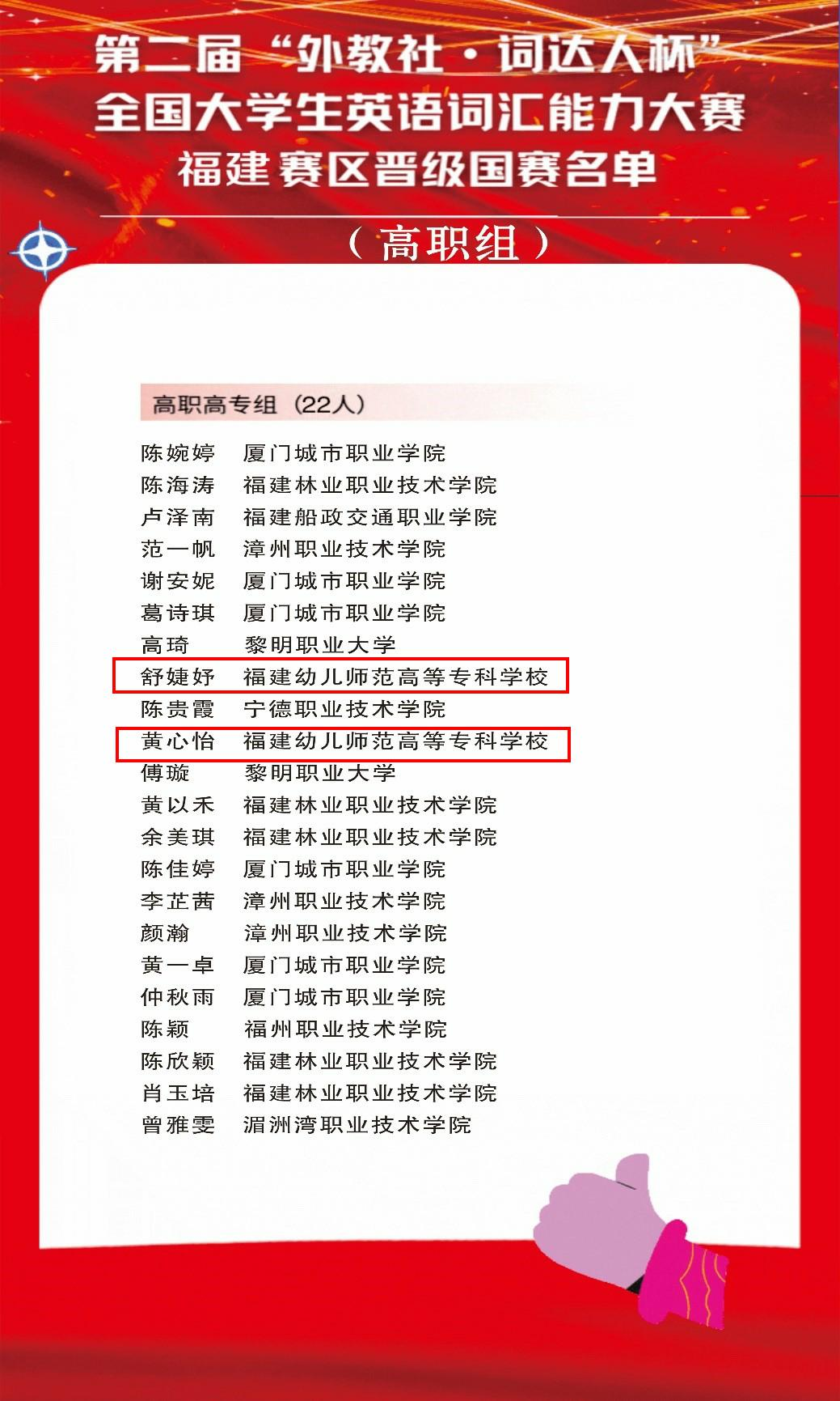 外语教育学院英语教育专业2020级舒婕妤同学(指导老师:叶一青)、英语教育专业2020级黄心怡同学(指导老师:覃涛涛)以福建赛区一等奖的优异成绩,冲出重围、晋级国赛。我校学生在福建赛区比赛中斩获高职组一等奖两项、二等奖五项、三等奖两项!