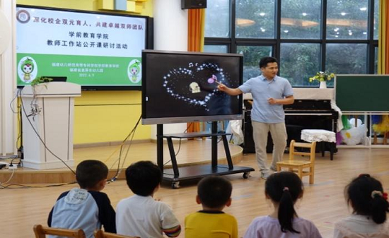 为响应《国家职业教育改革实施方案》中提出的"促进产教融合,校企'双元'育人"新发展理念,学前教育学院本着"校·园"双方合作共赢的模式,持续开展教师工作站项目。本学期,音乐教研室杨滨副教授分别在福建幼儿师范高等专科学校第一附属幼儿园和省直屏东幼儿园开展工作站活动,深入幼儿园班级日常的各项活动,并积极参与幼儿园的音乐教育教学研究等多项教研活动。由于杨滨副教授具有深厚扎实的专业能力和丰富的教学经验,他先后开展了幼儿音乐感知力训练系列活动、根据幼儿园一日活动需求创作了30余首幼儿歌曲,期间还有针对性指导了幼儿园教师的音乐教育教学工作,切实为幼儿园音乐教研活动提供极大的帮助。2022年6月9日下午,我校国家级职业教育教师教学创新团队负责人、学前教育学院院长吴丽芳教授、教师教育学院副院长、学前教育学院林萍副院长与音乐教研室老师们一行13人,到福建省省直机关屏东幼儿园参加了杨滨老师的公开课《小班音乐活动:快乐的梦想》研讨活动,省直机关屏东幼儿园陈晓霞园长、池频副园长全程陪同参与了本次活动。