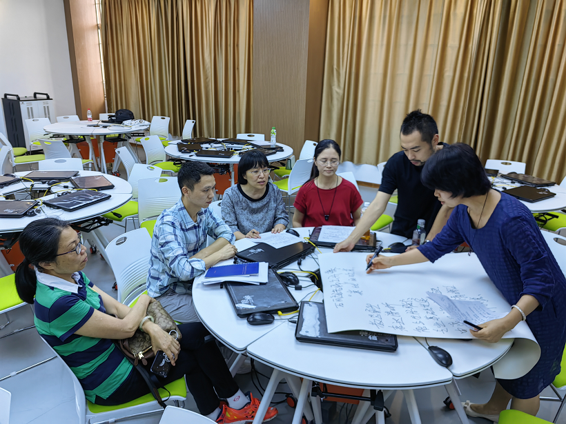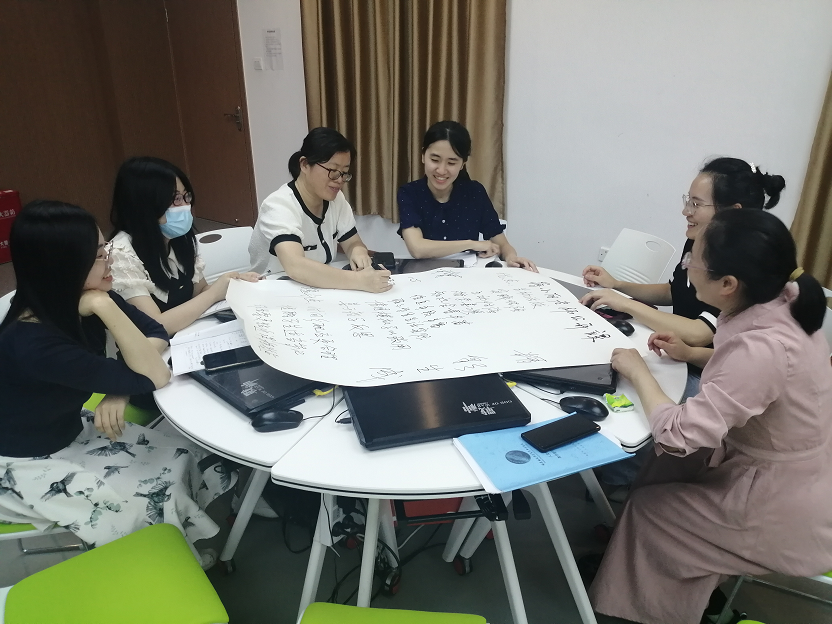 课后,全院教师采用学习共同体的方式开展研讨,各组老师围绕"教学目标、教学设计、课程思政、学生课堂参与度"等评价要点畅所欲言,并由组长将本组教师的发言要点记录在分享纸上。充分讨论后,各小组选派一名教师进行分享总结点评。
