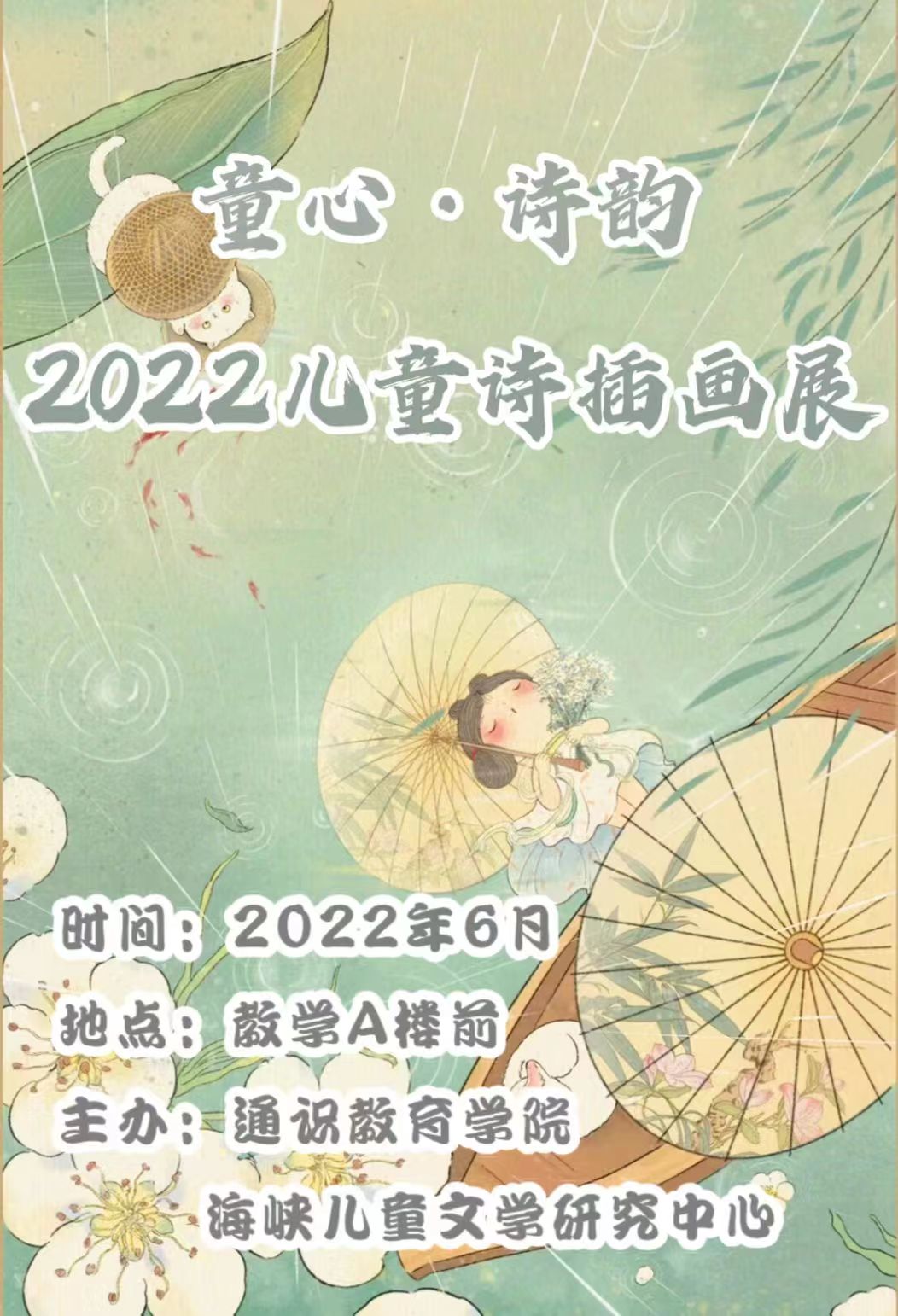 2022年6月20日"童心 童韵——2022童诗插画展"在仓山校区举办。活动由通识教育学院与海峡儿童文学研究中心主办,展出2021级同学的原创儿童诗歌插画近二百余幅优秀作品。此次活动充分展示了儿童文学课程之儿童诗歌章节以职业教育"实践取向"为理念,以实际技能和多元化综合素质的培养为中心的教学架构。