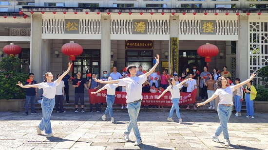 全体党员挥舞手中的红旗,以饱满的热情和矫健的舞姿诠释了红色精神,以一曲《我爱你中国》表达了对党和国家的热爱,用舞蹈讴歌新时代,展现了学前全体党员积极向上精神面貌。