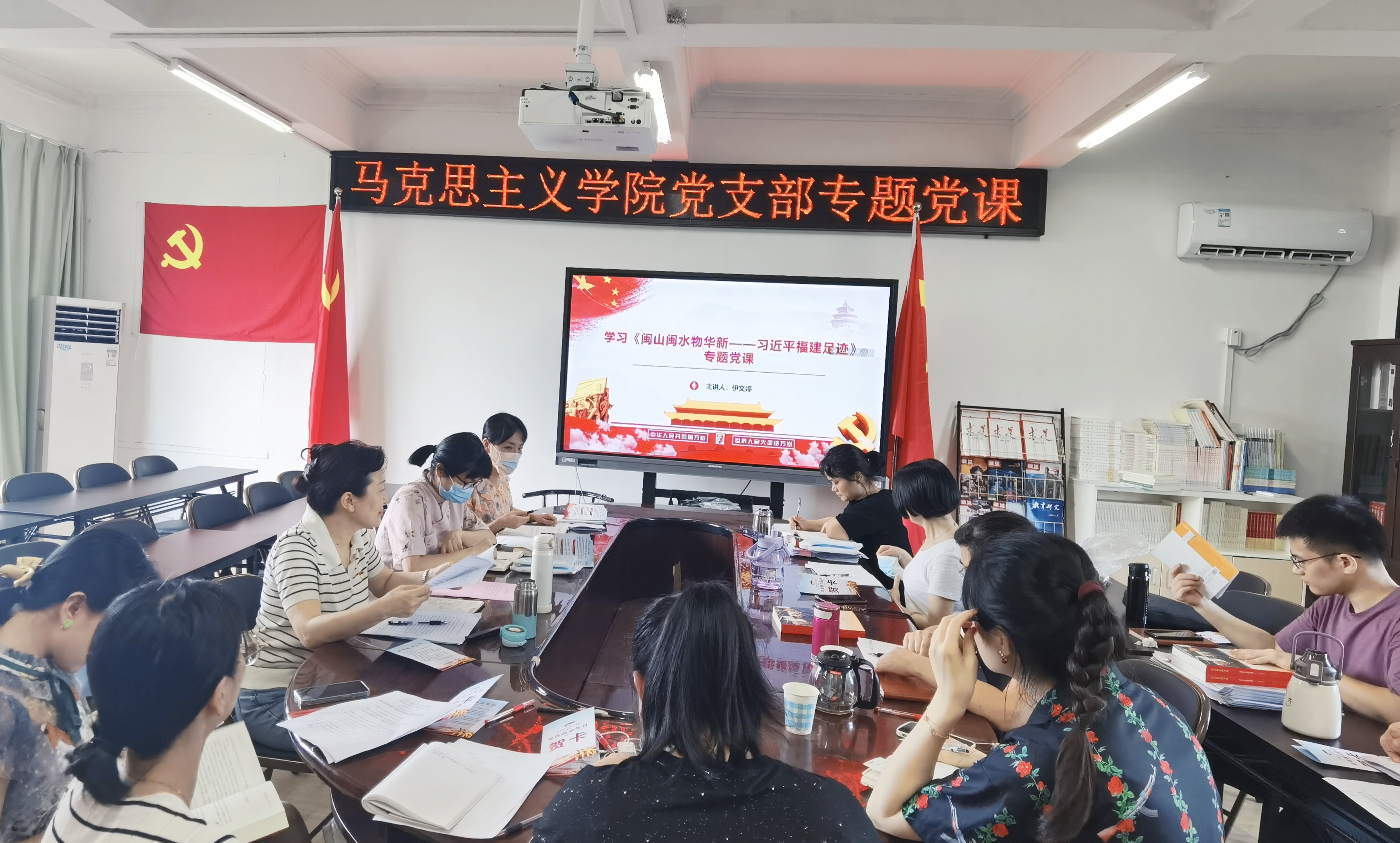 2022年6月29日,马克思主义党支部组织开展《闽山闽水物华新——习近平福建足迹》专题党课。马克思主义学院党支部书记伊文婷带领大家共同学习领悟。全体党员作交流发言。