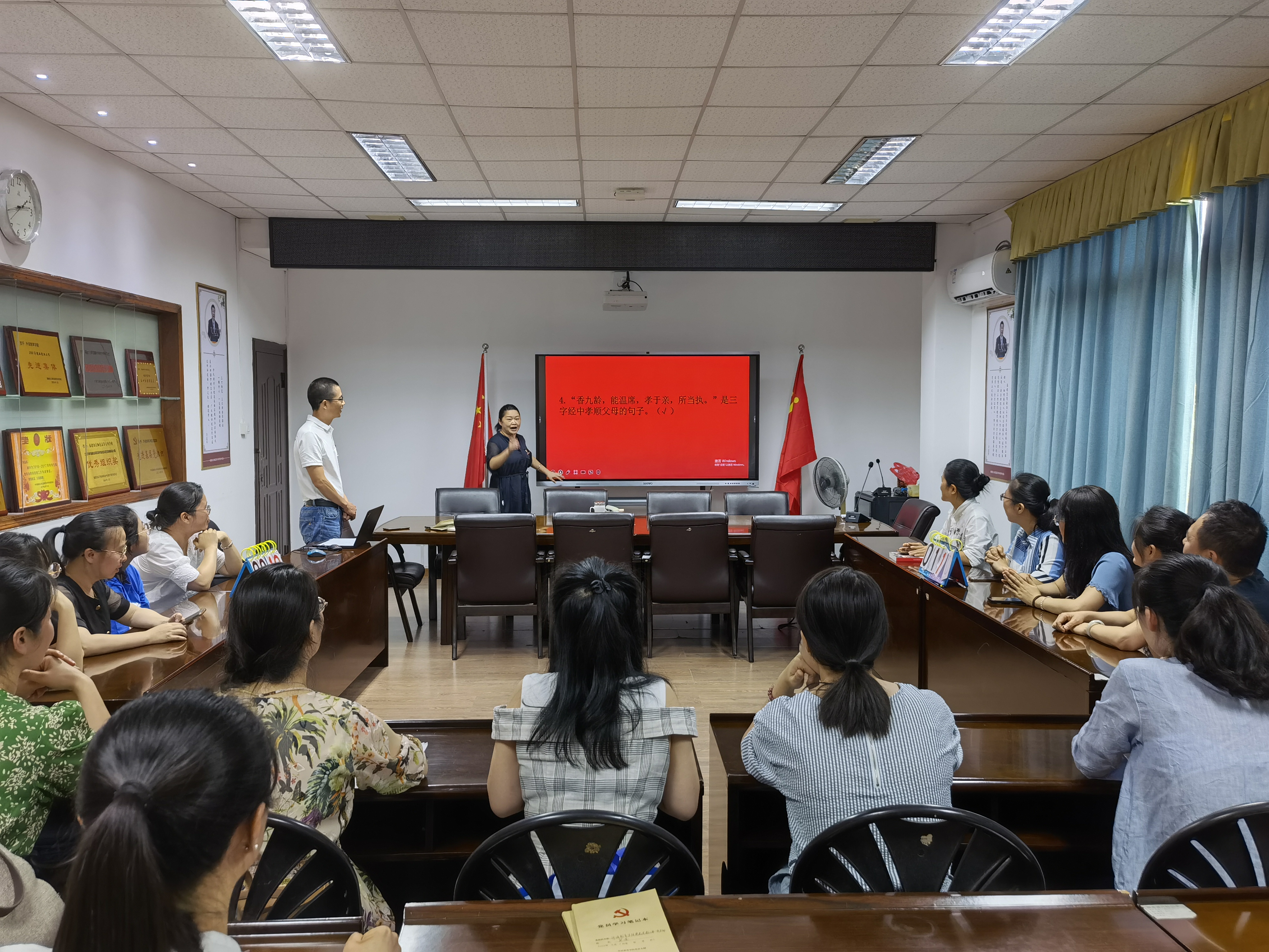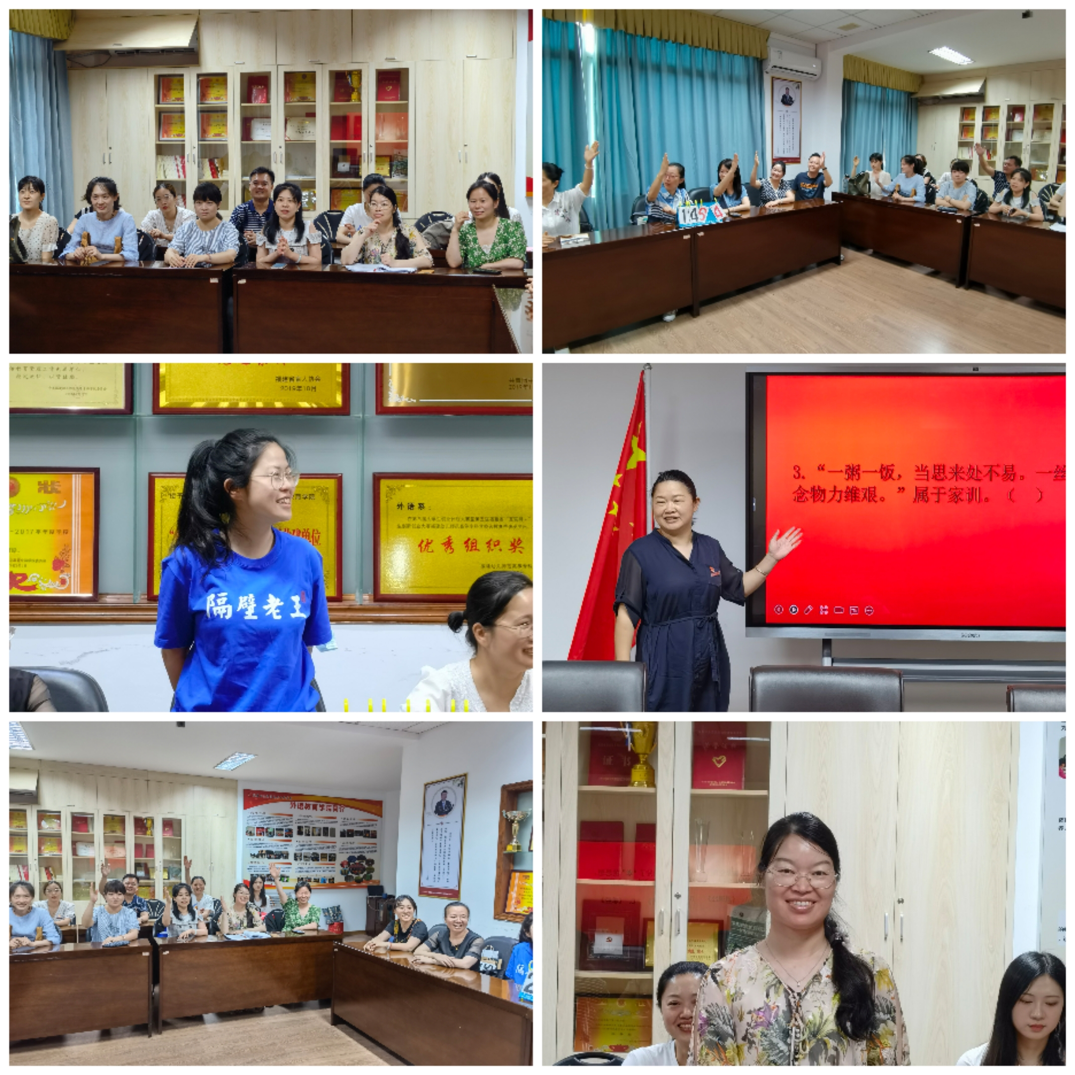 为深入学习贯彻习近平总书记关于注重家庭家教家风建设的重要论述,弘扬中华优秀传统文化,传承优良家教家风,助推廉洁文化建设,展现新时代家庭文明风采,凝聚和传递家庭美德正能量,以实际行动迎接党的二十大胜利召开。6月30日,外语教育学院工会于金山校区开展"建设好家风 喜迎二十大"知识竞赛活动。竞赛以分组抢答和必答形式进行,内容以党风廉政及家风家训相关知识为主。通过活动,工会会员们纷纷表示要更加注重家庭、注重家风,主动培育和践行社会主义核心价值观。