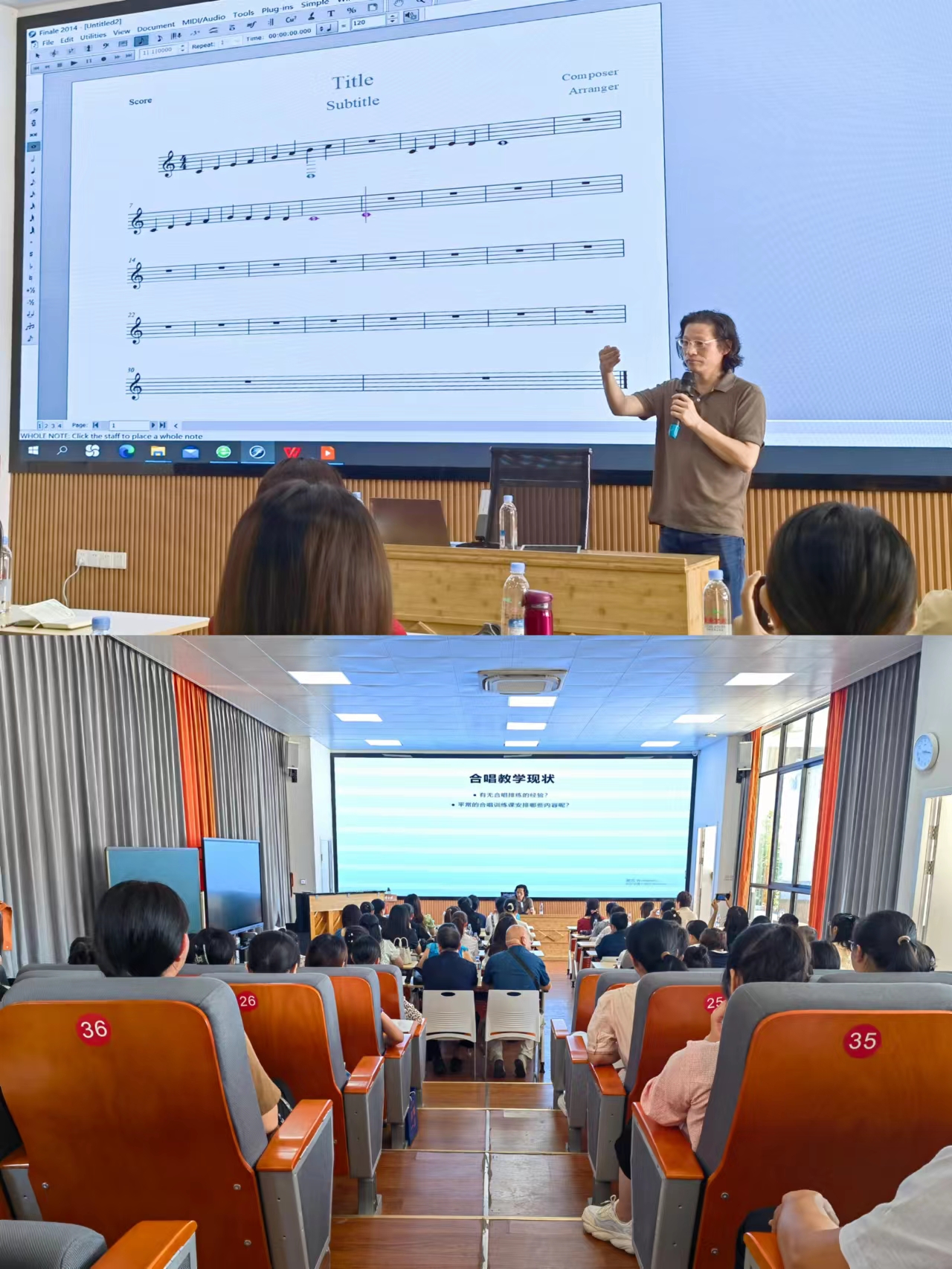 8月11日,团队教师、福建省合唱协会常务理事陈语老师围绕《童声合唱的训练与指导》的主题,基于永安市中小学合唱教学情况,从视谱能力训练、合唱基础训练、歌唱能力训练、多声部歌唱能力的建立等四个方面具体阐述了如何开展童声合唱训练。陈语老师风趣幽默的语言,逐渐消解现场一线音乐老师的紧张心理,从开音到开心再到开怀,老师们全情融入到合唱教学情境中。陈语老师以其丰富的合唱训练与指导实践经验,解锁一线教师在合唱教学过程中的疑难问题,提升了音乐教师们开展合唱训练的素养和能力,分享的合唱前沿信息开阔了一线教师的视野。
